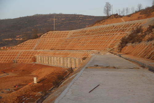 本工程开工时间 2012年12月竣工时间 2015年11月,历时37个月。共完成抗滑桩7668m3,挡土板1429m3,灌注桩203.47m3,微型桩18741m,混凝土连系梁320.68m3,肋柱挡墙410.29m3,预应力锚索18450m,锚杆6750m,M7.5浆砌石挡墙5512.16m3,加筋土22358m3,仰斜排水孔4630m,截排水沟1878.45m3,渗水盲沟71.67m3,平台硬化324.5m3,泄水孔1047.5m,土方553894m3,变形监测1750点次。