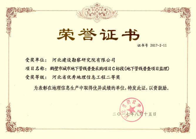 近日,经河北省测绘学会评选,由我公司承担的鹤壁市城市地下管线普查采购项目C标段(地下管线普查项目监理)荣获河北省优秀地理信息工程二等奖。