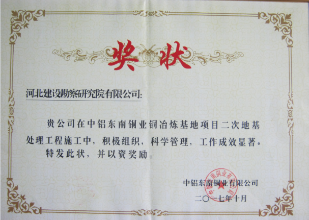 公司承接的福建省宁德市中铝东南铜业铜冶炼基地项目二次地基处理工程,施工中严格执行公司规章制度及综合管理体系标准,精心策划,严格控制,科学管理。在现场10多家施工单位各项检查评比中,得到了业主中铝东南铜业有限公司的表扬,对现场安全、质量、进度管理给予了高度评价,分别授予“项目管理突出”奖和“质量管理”奖。
