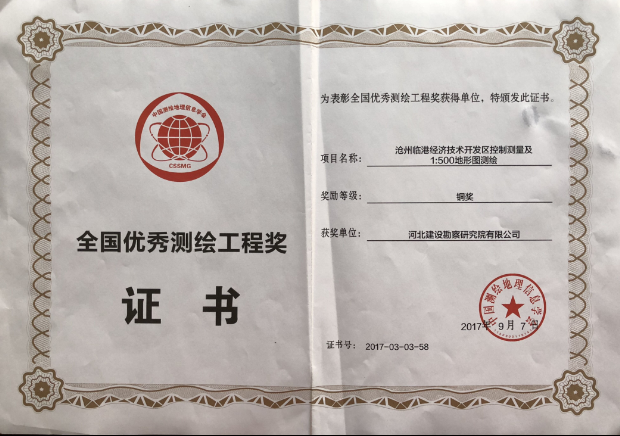 2017年9月7日,由我公司完成的沧州临港经济技术开发区控制测量及1:500地形图测绘项目,被中国测绘地理信息学会授予全国优秀测绘工程铜奖。