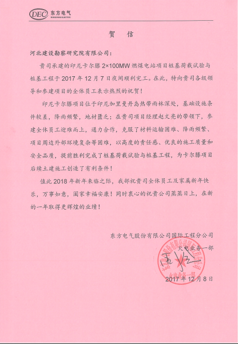 我公司承建的印尼卡尔滕2*100MW燃煤电站项目桩基荷载试验与桩基工程于2017年12月7日夜间顺利完工。东方电气股份有限公司国际工程分公司发来贺信,向我公司项目员工表示祝贺。