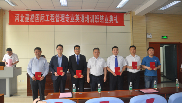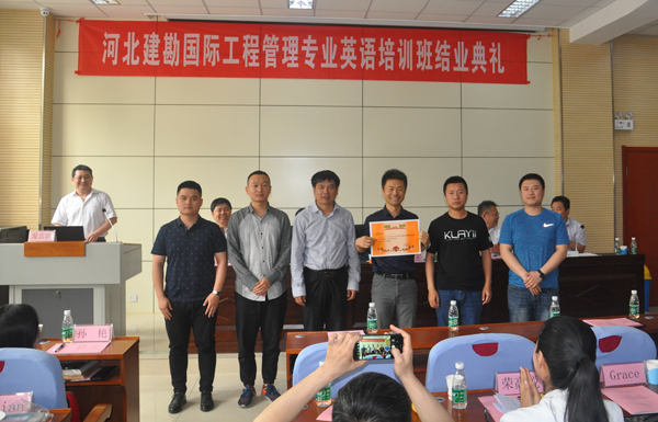 公司委托石家庄铁道大学继续教育学院举办的首届国际工程管理专业英语培训班(共29人,分6组),经过28天的紧张培训,已经完成全部课程的学习。2018年5月14日下午,石家庄铁道大学第九实验室103教室,书声琅琅,掌声雷鸣,公司首届国际工程管理专业英语培训班结业典礼在这里举行,出席结业典礼的有:公司总经理李华伟、总工程师聂庆科、人力资源部主任张军旗及全体学员;石家庄铁道大学副校长陈进杰、继续教育学院院长王书海、继续教育学院副院长杨杰、外语系党支部书记林治华、外语系副主任李玉洁、培训班班主任孙艳以及教师和助教。