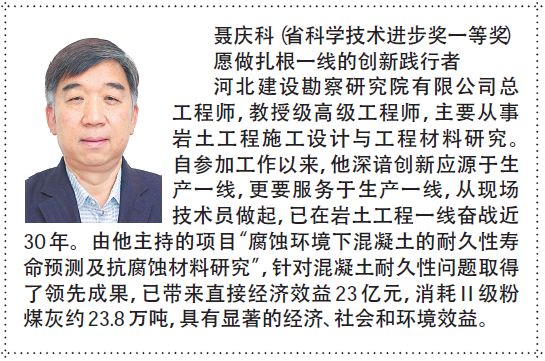 6月5日,河北日报专版文章《群英荟萃 硕果累累》对2017年度河北省科学技术奖获奖人风采进行展示。我公司的完成的《腐蚀环境下混凝土的耐久性寿命预测及抗腐蚀材料研究》获得一等奖,聂庆科总工程师作为第一完成人在专版文章中进行了刊载,这是以聂总为代表的广大专业技术人员的共同光荣,也必将激励我们更加努力争创新的科技成果和荣誉。