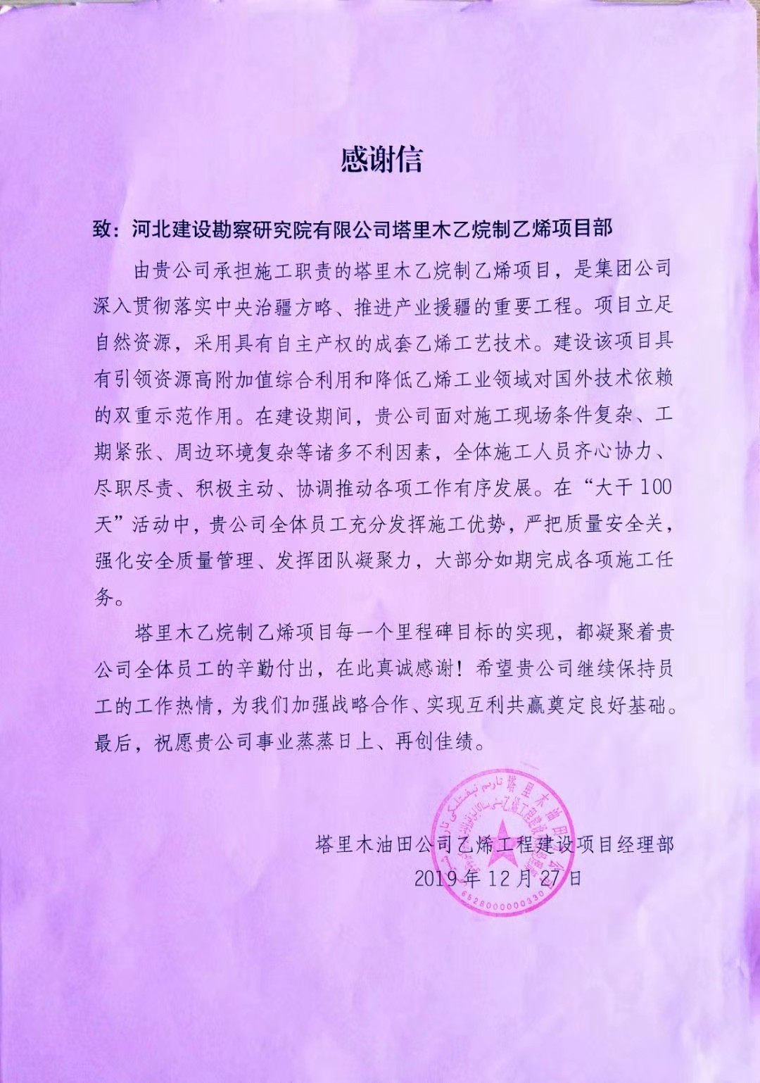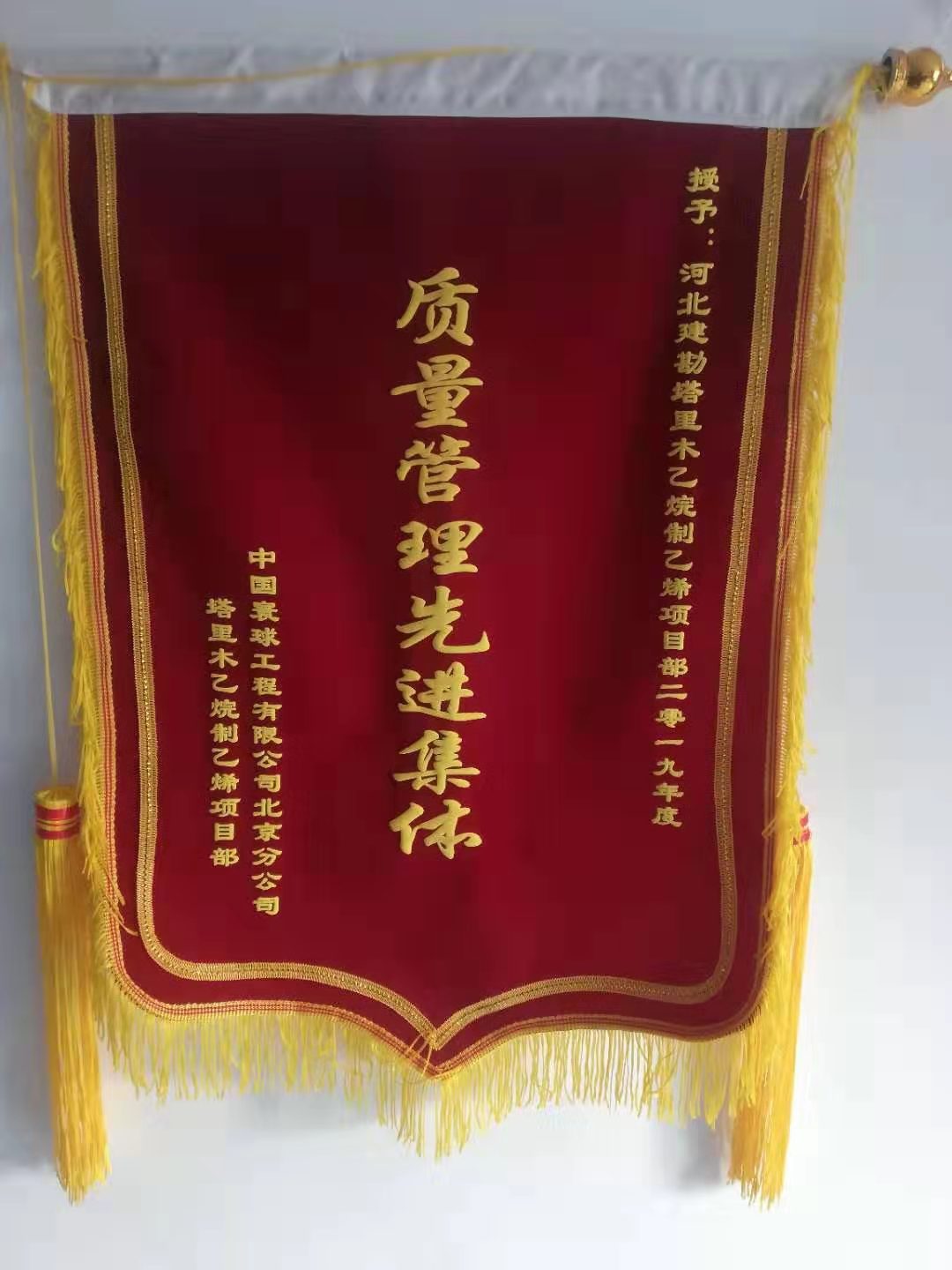 公司近日收到业主塔里木油田公司乙烯工程建设项目经理部的感谢信及中国寰球工程有限公司北京分公司的质量管理先进集体锦旗。在建设期间,我公司面对现场条件复杂、工期紧张等诸多不利因素,全体施工人员齐心协力、尽职尽责、积极主动、协调推动各工作有序开展,在施工中,严把质量安全观、强化安全质量管理、发挥团队凝聚力,很好的完成了各项施工任务,为双方进一步加强战略合作、实现互利共赢奠定了良好基础。