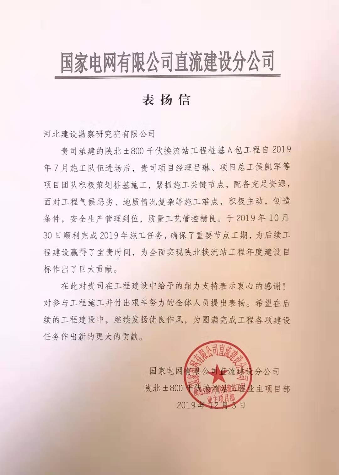另有陕北换流站项目部也收到国家电网直流建设分公司的感谢信,该项目自2019年7月进场后,在项目经理吕琳、项目总工侯凯军等精心组织和艰苦努力下,顺利完成施工任务,确保了重要节点工期,为后续工程建设赢得了宝贵时间,为全面实现陕北换流站工程年度建设目标作出巨大贡献,受到业主的充分肯定和高度表扬。