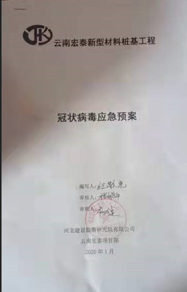 在新闻报道疫情初期,正月初二,云南宏泰桩基工程项目部便成立应急小组,为抗击疫情做了很多预防措施,编制应急预案。