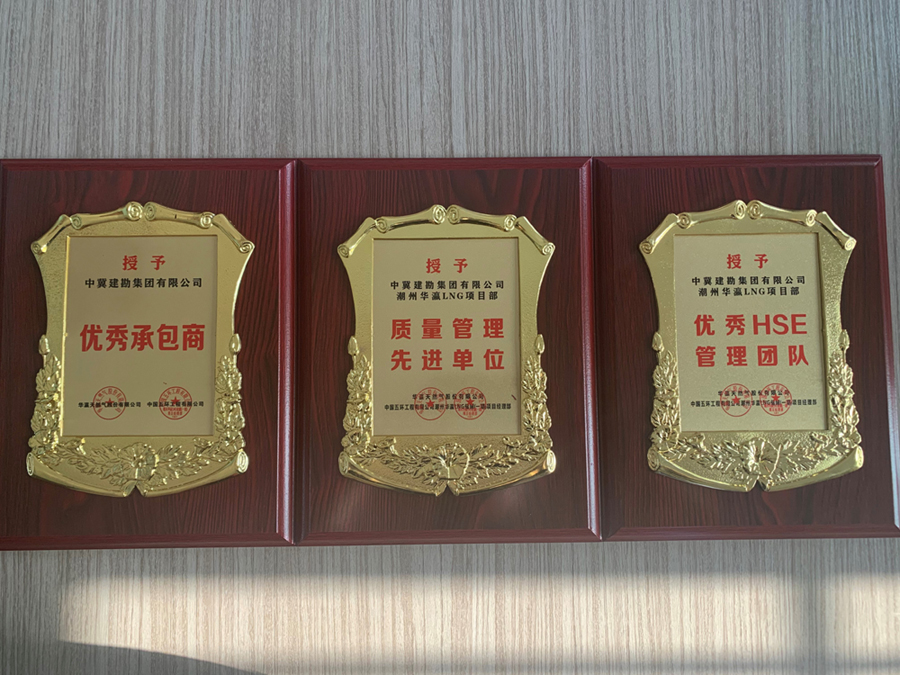 近日,由我公司承建的潮州华瀛液化天然气接收站项目储罐工程桩基施工项目,荣获华瀛天然气股份有限公司和中国五环工程有限公司潮州华瀛LNG项目部颁发的“优秀承包商”、“质量管理先进单位”和“优秀HSE管理团队”的荣誉奖牌以及感谢信。