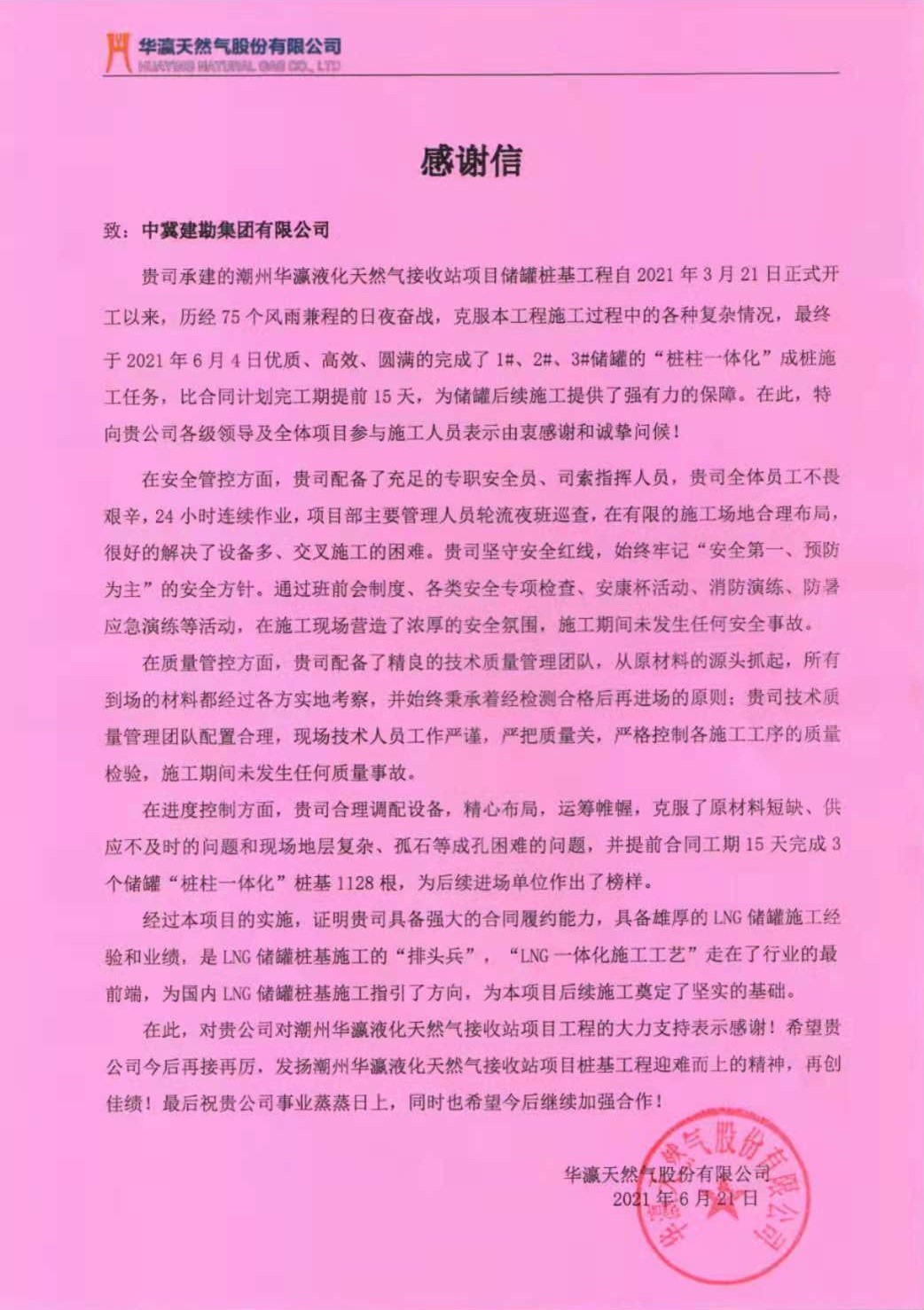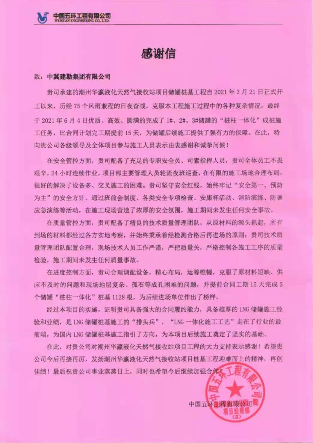 我项目部施工期间正值年初建筑市场复苏原材料全面涨价阶段,面对现场原材价格不断上涨且供应不足的问题,非常感谢总公司及各位领导的大力支持;面对设备多、工期紧,任务重,我公司潮州华瀛LNG项目部,充分发扬能吃苦、能战斗的精神,提前谋划,合理组织、精心安排,积极配合业主进度计划,保质保量的比合同工期提前15日完成所有桩基施工任务。我单位在安全管理、施工质量管理方面为建设方、监理方、总包方留下深刻影响,为此项目部得到了中国五环工程有限公司潮州华瀛LNG项目经理部以及华瀛天然气股份有限公司高度认可!