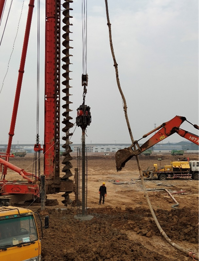 本工程2#、3#厂房桩基成孔采用长螺旋后插筋工艺,混凝土压灌完成后,进行钢筋笼安放工作,钢筋笼安放采用25T吊车和振杆、震动器(采用闭合式链接)配合进行。钢筋笼下入孔中后,保证在孔内居中,先由钢筋笼量与振锤自身的重量让钢筋笼自行下沉,当不能自行下沉时(约达到3/1-3/2笼长时),立即开动震锤,边振动混凝时钢筋笼边随着下沉,钢筋笼随着振动下沉至到桩顶标高位置后,采用双吊筋固定钢筋笼位置,缓慢将导管从桩身中拔出,并开动震锤,即完成了该桩的施工。当遇见孔口下沉现象时,先用人工清理出表面混凝土,再由钻机开至孔口进行补方。