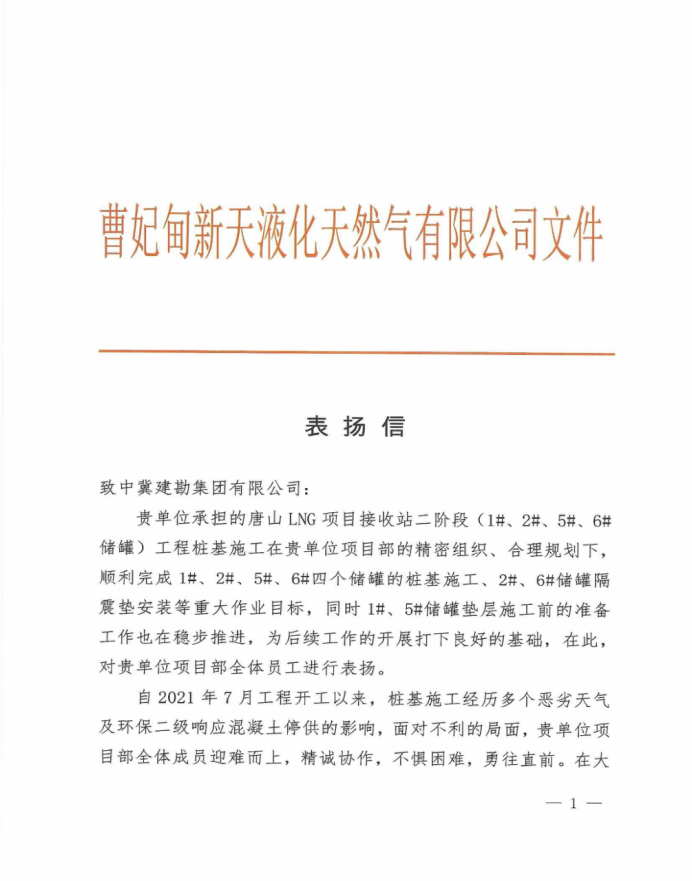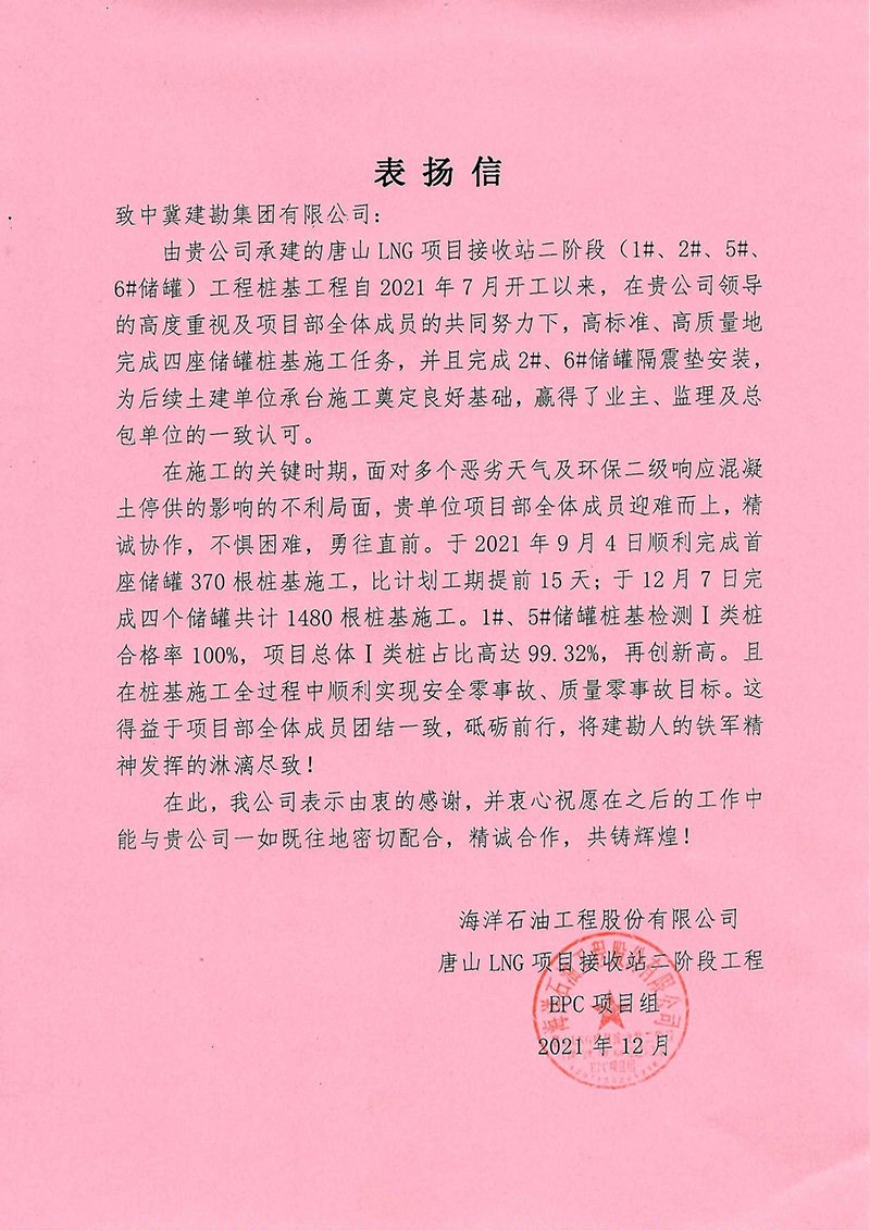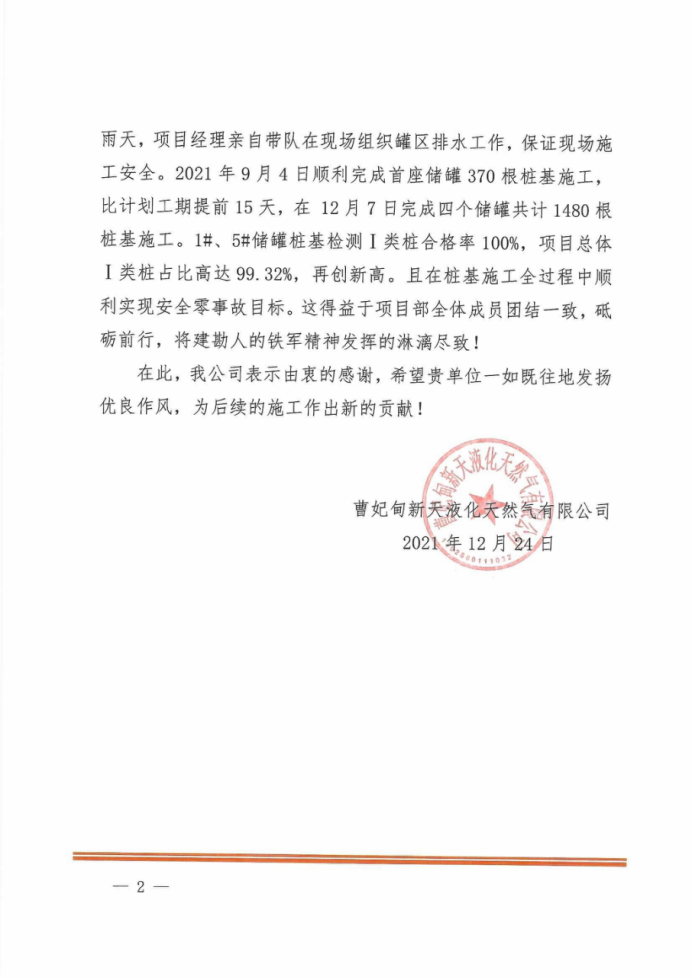 唐山LNG项目接收站二阶段工程桩基工程项目部建设规模为4座20万m³LNG储罐,项目顺利实现质量零事故、安全零事故目标,赢得总包、监理及业主的一致认可与高度肯定。