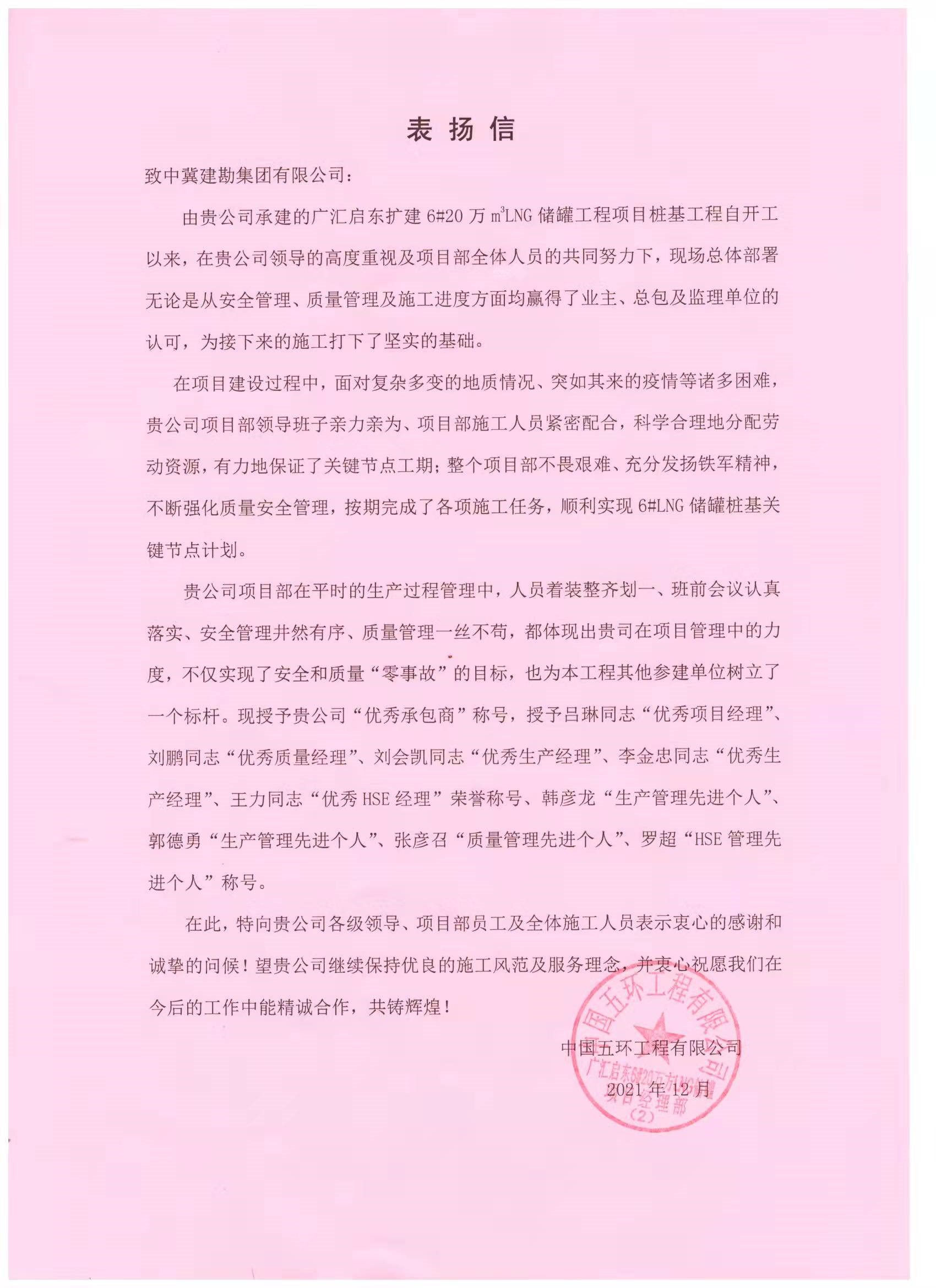 近期公司连续收到业主及总包发来的表扬信,对我公司项目的质量及安全管控等方面的工作表示了一致认可。