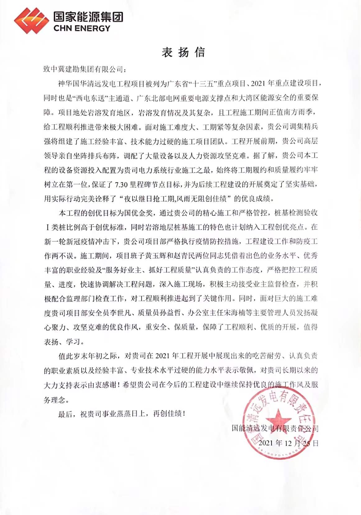 神华国华清远发电工程项目被列为广东省“十三五”重点项目、2021年重点建设项目,同时也是“西电东送”主通道、广东北部电网重要电源支撑点和大湾区能源安全的重要保障。我项目在建设过程中 “夜以继日抢工期,风雨无阻创佳绩”的工作效率得到了高度赞扬。