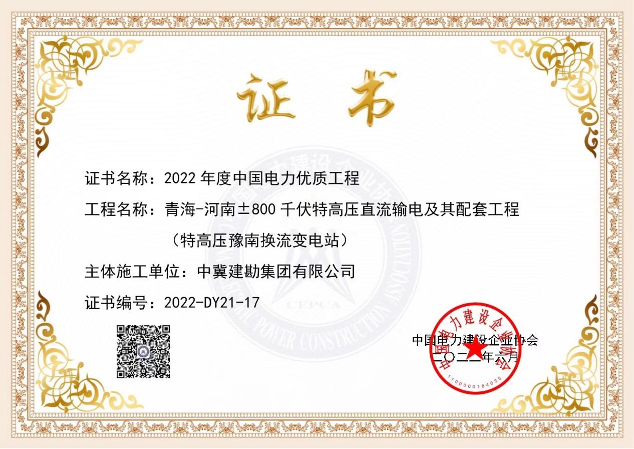 近日,中国电力建设企业协会公布了2022年度中国电力优质工程评审结果,我公司作为青海-河南±800千伏特高压直流输电及配套工程(特高压豫南换流变电站)桩基施工单位,荣获2022年度中国电力行业优质工程奖。“中国电力优质工程奖”是我国电力建设行业工程质量的最高荣誉,公司获此殊荣,充分彰显了我公司在行业内雄厚的综合实力,树立中冀建勘在电力行业的良好企业形象。