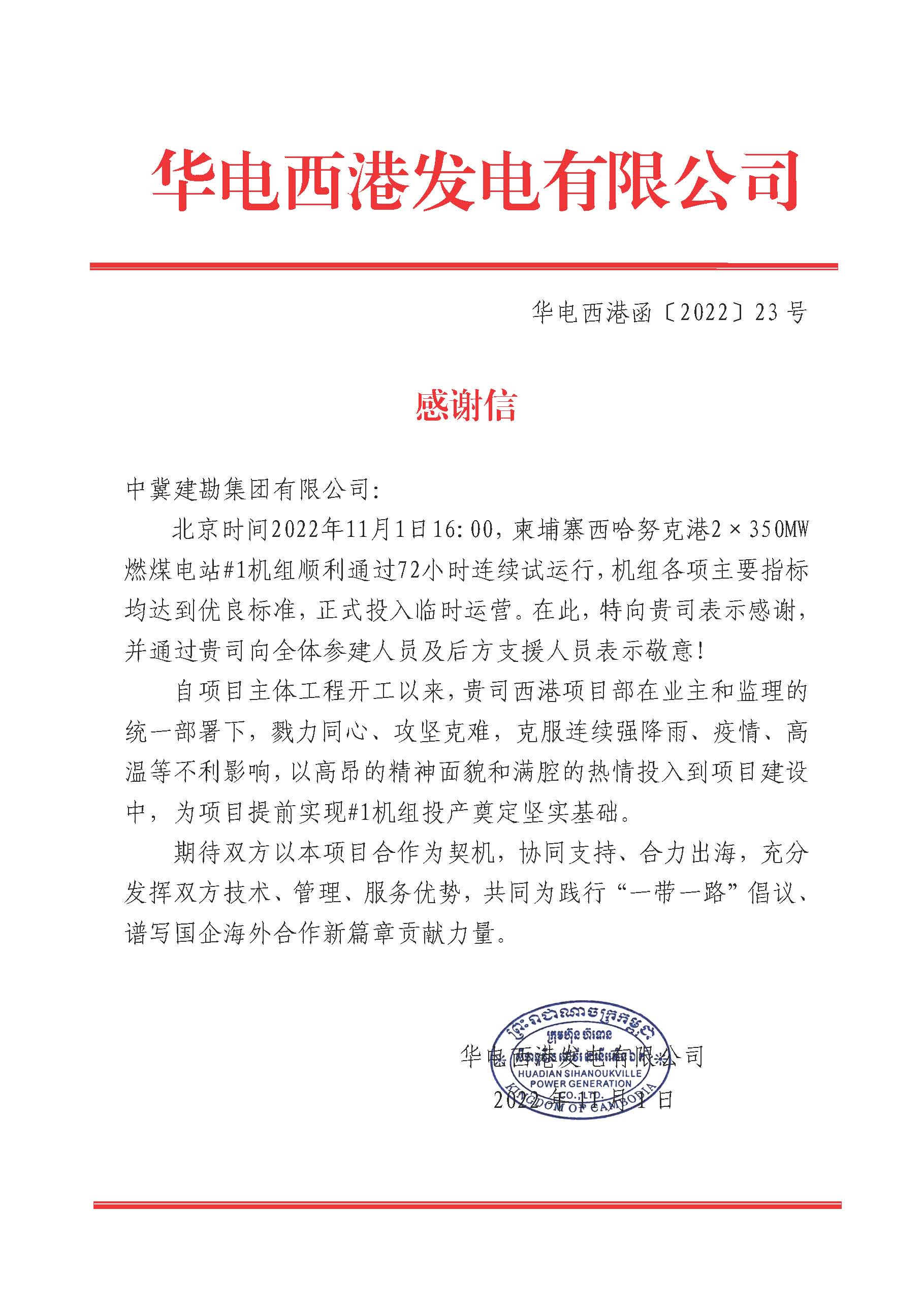 北京时间2022年11月1日16:00,由我公司承建的柬埔寨西哈努克港2×350MW燃煤电站#1机组顺利通过柬埔寨国家电力公司要求的满负荷性能试验,标志着中国华电在柬投资兴建的最大火电项目首台机组正式投产发电。该项目是中国华电在“一带一路”沿线国家投资建设的重点工程,也是目前中国在柬单体投资最大电源项目。业主华电西港发电有限公司特向我公司表示感谢,并对我公司全体参建人员及后方支持人员表示敬意!