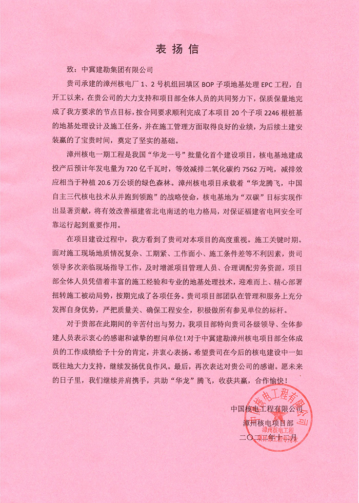 漳州核电一期工程是我国“华龙一号”批量化首个建设项目,承载着“华龙腾飞,中国自主三代核电技术从并跑到领跑”的战略使命,核电基地为“双碳”目标实现作出显著贡献,是国家核电建设的重点项目。在工程建设过程中面对规模较大、场地分散、交叉施工等多项不利因素,项目部迎难而上、精心部署、昼夜施工,确保安全、质量的情况下按期完成了各项任务。项目部在谷习光同志的带领下,在管理和服务上充分发挥自身优势,积极争当所有参见单位的标杆,得到了甲方和监理的高度赞扬,为以后更多的合作奠定了坚实基础。