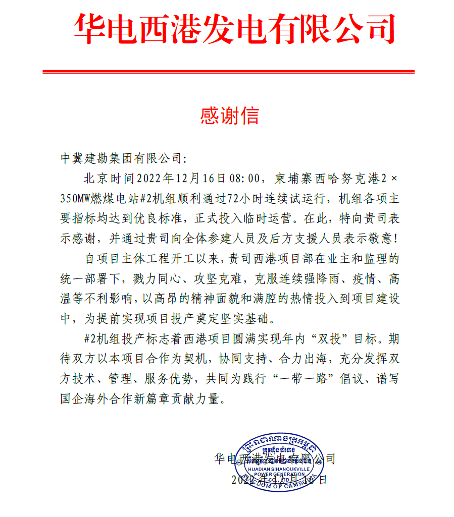 柬埔寨西哈努克港2×350MW燃煤电站#1机组顺利通过柬埔寨国家电力公司要求的满负荷性能试验,标志着中国华电在柬投资兴建的最大火电项目首台机组正式投产发电。自该项目主体工程开工以来,西港项目部全体人员在业主和监理的统一部署下,勠力同心、攻坚克难,克服连续降雨、疫情、高温等不利影响,以高昂的精神面貌和满腔的热情投入到项目建设中,为项目提前实现#1机组投产奠定坚实基础。