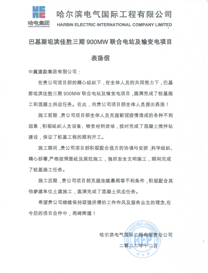 巴基斯坦滨佳胜三期900MW联合电站及输变电项目,圆满完成了桩基施工和混凝土供应任务。施工期间,项目部员工积极配合业主的协调与安排,科学组织、精心部署,严格按照图纸及规范施工,在克服连续暴雨等不利条件,抢抓安全文明施工,确保圆满完成施工任务。我们顽强拼搏的工作作风及服务业主的理念得到了业主的高度认可。