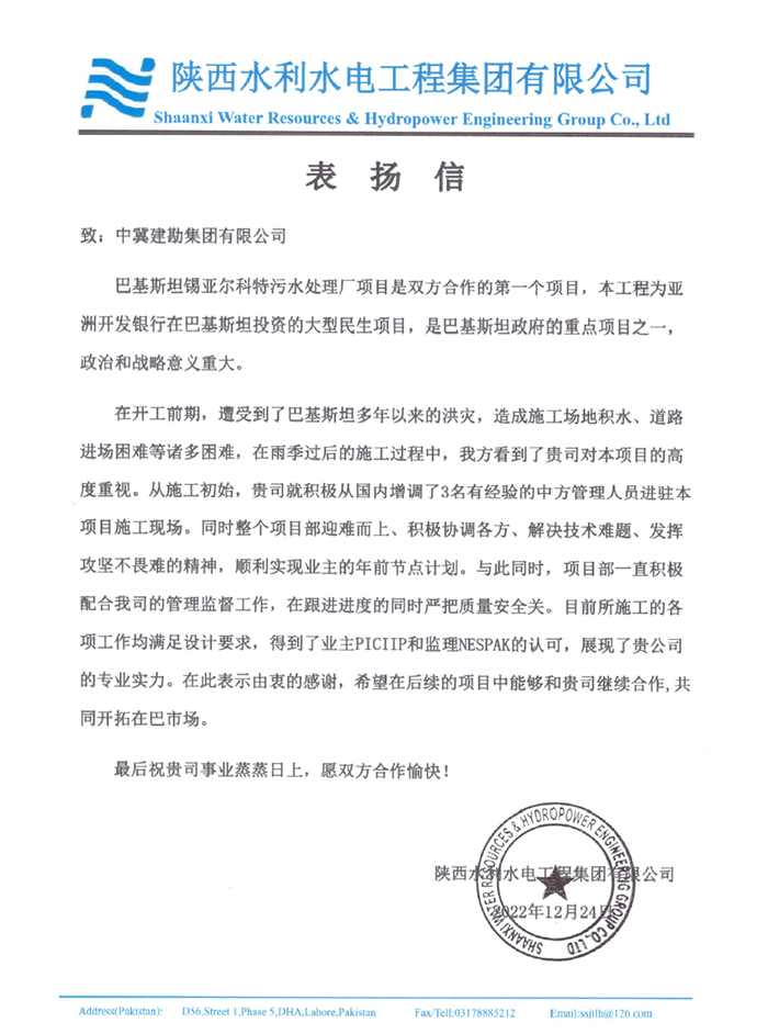 巴基斯坦锡亚尔科特污水处理厂项目是我方和陕西水利水电工程集团有限公司合作的第一个项目,是亚洲开发银行在巴基斯坦投资的大型民生项目,是巴基斯坦政府的重点项目之一,政治和战略意义重大。在工程前期,遭受到了巴基斯坦多年以来的洪灾,造成施工场地积水、道路进场等诸多困难。我们整个项目部高度重视,迎难而上、积极协调各方、解决技术难题、发挥攻坚不畏难的精神,顺利实现业主的年前节点计划。目前施工的各项工作均满足设计要求,得到了业主PICIIP和监理NESPAK的认可,展现了我公司的专业实力。业主希望在后续的项目中能够和我公司继续合作,共同开拓巴基斯坦市场。