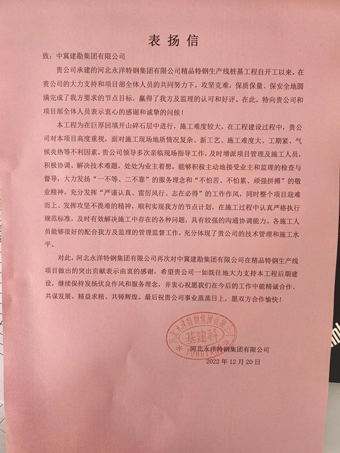 河北永洋特钢集团有限公司精品特钢生产线桩基工程自开工以来,在项目部全体人员的共同努力下,攻坚克难,保质保量保安全地圆满完成了业主要求的节点目标,大力发扬“一不等、二不靠”的服务理念和“不怕苦、不怕累、顽强拼搏”的敬业精神,赢得了业主及监理的认可和好评。