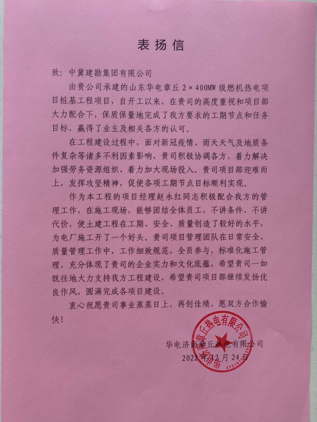 山东华电章丘2×400MW级燃机热电项目桩基工程,在工程建设过程中,面对新冠疫情、雨天天气及地质条件复杂等诸多不利影响,在项目经理赵永红同志的带领下,能够团结一致,不讲条件,使土建工程在工期、安全、质量创造了较好的水平,为电厂施工开了一个好头。项目管理团队在日常安全、质量管理工作中,工作细致规范、标准化施工管理,充分体现了我公司的企业实力和文化底蕴。