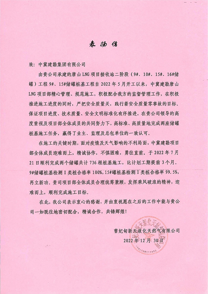 2022年12月30日我公司收到业主曹妃甸新天液化天然气有限公司发来的表扬信。由我公司承建的唐山LNG项目接收站二阶段(9#、10#、15#、16#储罐)工程9#、15#储罐桩基工程,主要施工内容为736根桩径1.4m、桩长71m/74m混凝土灌注桩,本项目自2022年5月31日开工以来,在唐山LNG项目部精心管理、规范施工下,严把安全质量关,践行着安全质量零事故目标,于2022年7月21日顺利完成所有施工任务,赢得业主、监理及总包的一致认可。桩基检测完成后,9#储罐桩基检测I类桩率100%,15#储罐I类桩率99.5%,再创新高。在施工过程中,项目部全体成员面对恶劣天气的不利影响及新冠疫情肆虐的局面,迎难而上,精诚协作,砥砺前行,淋漓尽致地诠释了建勘人的铁军精神,为项目顺利完成奠定坚实基础。