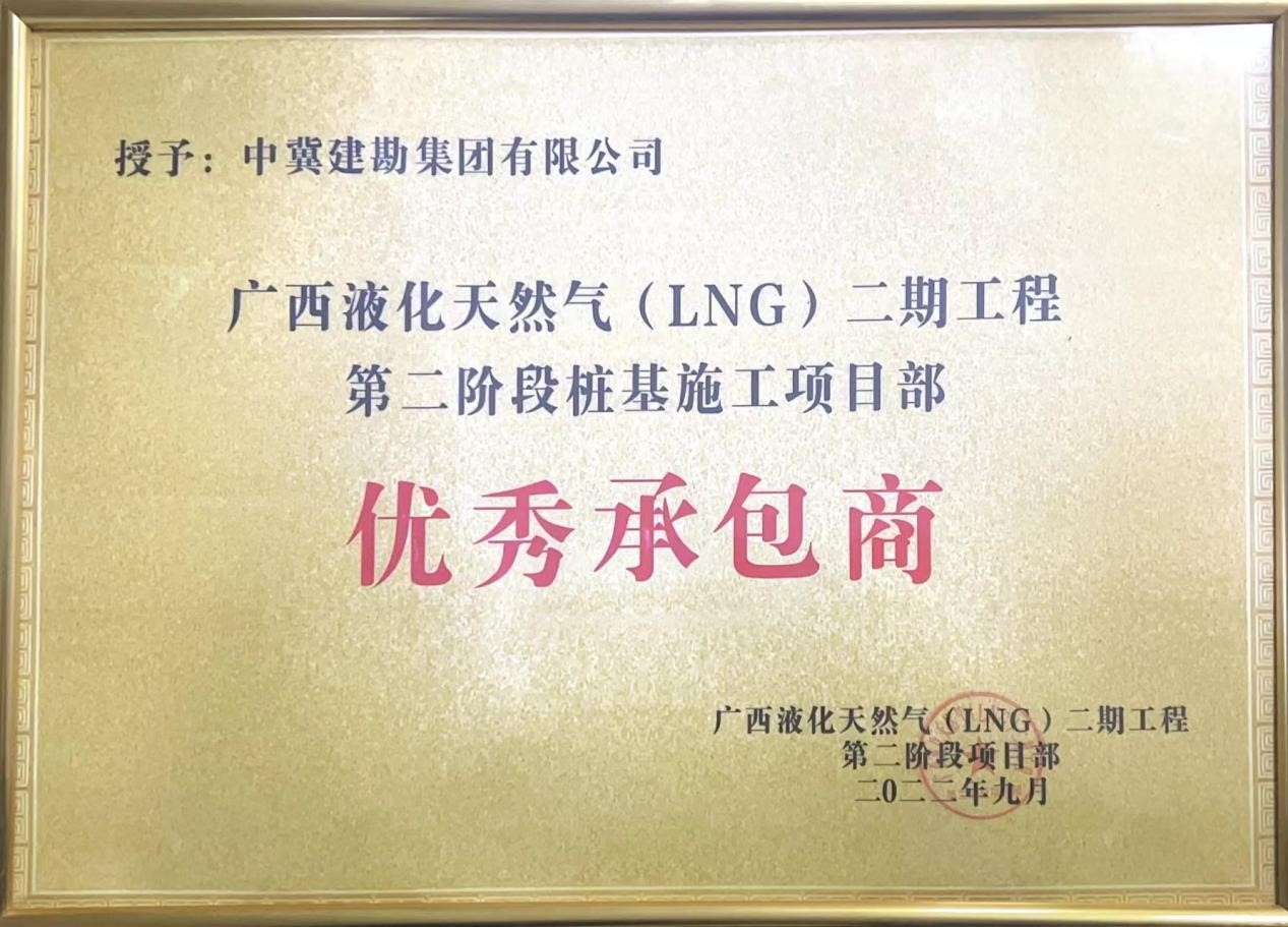 广西液化天然气LNG项目5#6#储罐桩基项目是国家管网集团北海液化天然气有限责任公司非常重视的项目。我公司自2022年04月承接了广西LNG二期项目储罐桩基施工,本项目于2022年5月20日开始,7月11日完成。从施工开始,本项目24小时昼夜不间断施工,为保障工程高质量高效率完成,施工期间,建设单位、PMC单位、监理单位及施工单位配备了充足的管理人员及施工人员,在疫情肆虐,天气炎热,雨季台风等一系列困难重重之下,广西LNG项目部全体员工保持高度的工作热情,克服一切艰难险阻,顺利完成了桩基施工全部任务。桩基检测结果全部为Ⅰ类桩,保质保量的完成了各个里程碑节点目标,荣获国家管网集团北海液化天然气有限责任公司广西北海LNG二期项目部的表扬信及优秀优秀承包商集体荣誉。