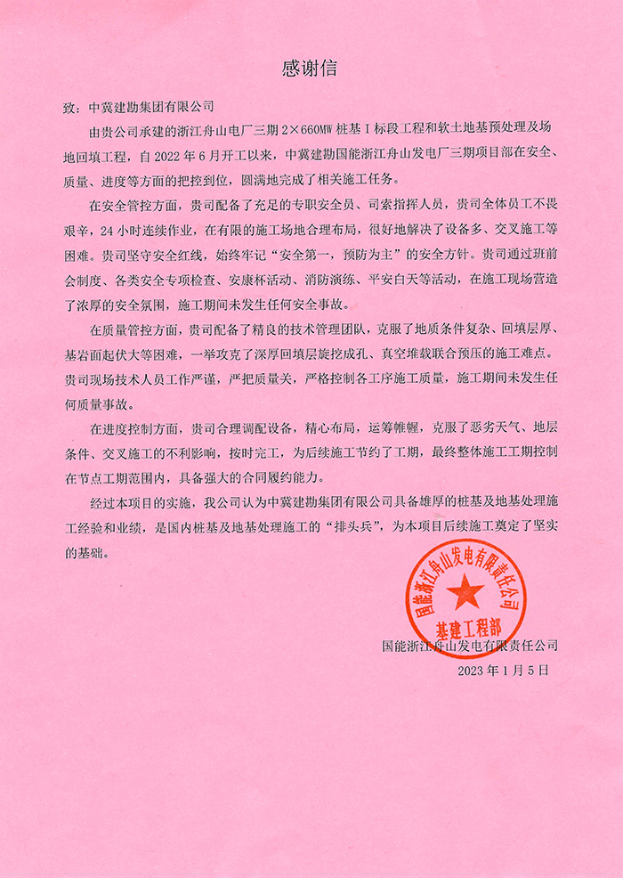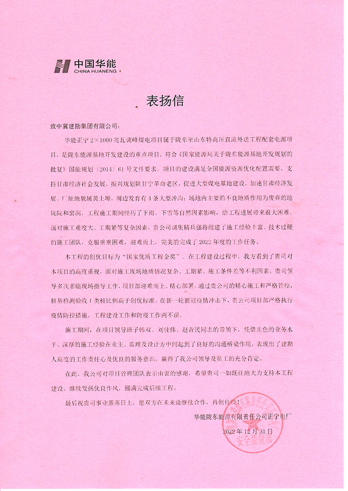 我公司华能甘肃正宁电厂二期工程项目部收到业主方华能陇东能源公司正宁电厂发来的表扬信,施工期间,在项目领导的带领下,凭借出色的业务水平、深厚的施工经验在业主、监理及设计方中间起到了良好的沟通桥梁作用。本工程的创优目标为“国家优质工程金奖”,我单位负责的B标段桩基检测验收I类桩比例高于创优标准。在新一轮新冠疫情冲击下,项目部严格执行疫情防控措施,工程建设工作和防疫工作两不误表现出了建勘人高度的工作责任心及优良的服务意识,赢得了华能陇东能源公司领导及员工的充分肯定。
