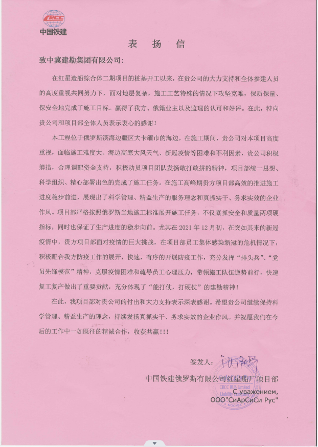 俄罗斯海参崴红星造船综合体(二期)项目,收到中国铁建俄罗斯红星船厂项目部的表扬信,施工期间,在项目领导的带领下,项目部统一思想、科学组织,经过305天的奋战,项目部完成了质量安全零事故,保质保量促进生产的任务目标。我公司负责的302、303、304厂房桩基检测验收全部合格。在施工高峰期克服了 新冠疫情、高寒天气、俄乌战争影响等诸多困难和不利因素,采取24小时不间断施工,积极调配合理高效的推进施工进度稳步前进。尤其在突如其来的新冠疫情中,项目部面对疫情的巨大挑战,积极采取措施,配合防疫工作的展开,快速,有序的开展隔离工作,安抚感染人员恐慌情绪。这种科学防疫、积极组织为后期快速复工复产做出了重要贡献,得到了总包单位的充分肯定和表扬。