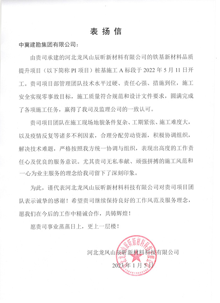 河北铁基新材料品质提升项目桩基A标段施工工程项目,开工以来圆满完成了业主要求的各个关键节点任务,施工期间以高昂的工作热情,合理的机械人工布置,完善的施工方案及技术要求,获得了业主们的高度认可。同时在疫情反复,现场地质条件复杂,工期紧张等诸多不利因素的情况下,仍然顽强拼搏,高安全、高质量的完成了施工任务。