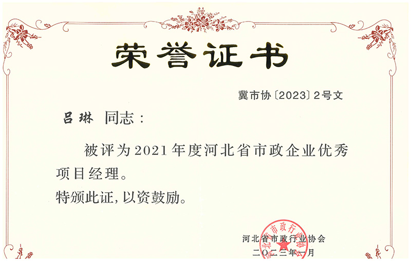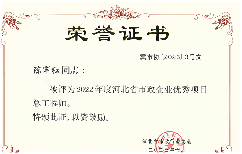 近日,经河北省市政行业协会组织选拔并发文公布,我公司王庆军同志、吕琳同志荣获 “2021年度河北省市政企业优秀项目经理” 荣誉称号;陈军红同志、张树楹同志荣获“2022年度河北省市政企业优秀项目总工程师”荣誉称号。