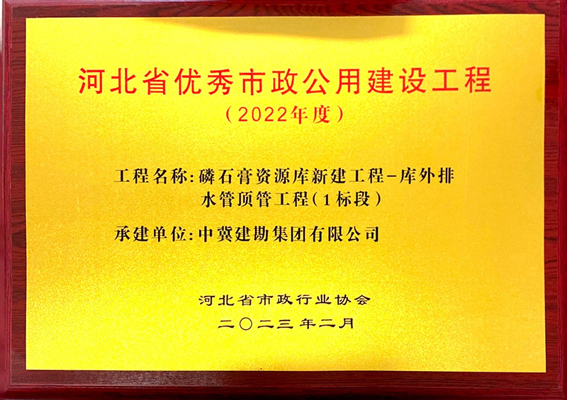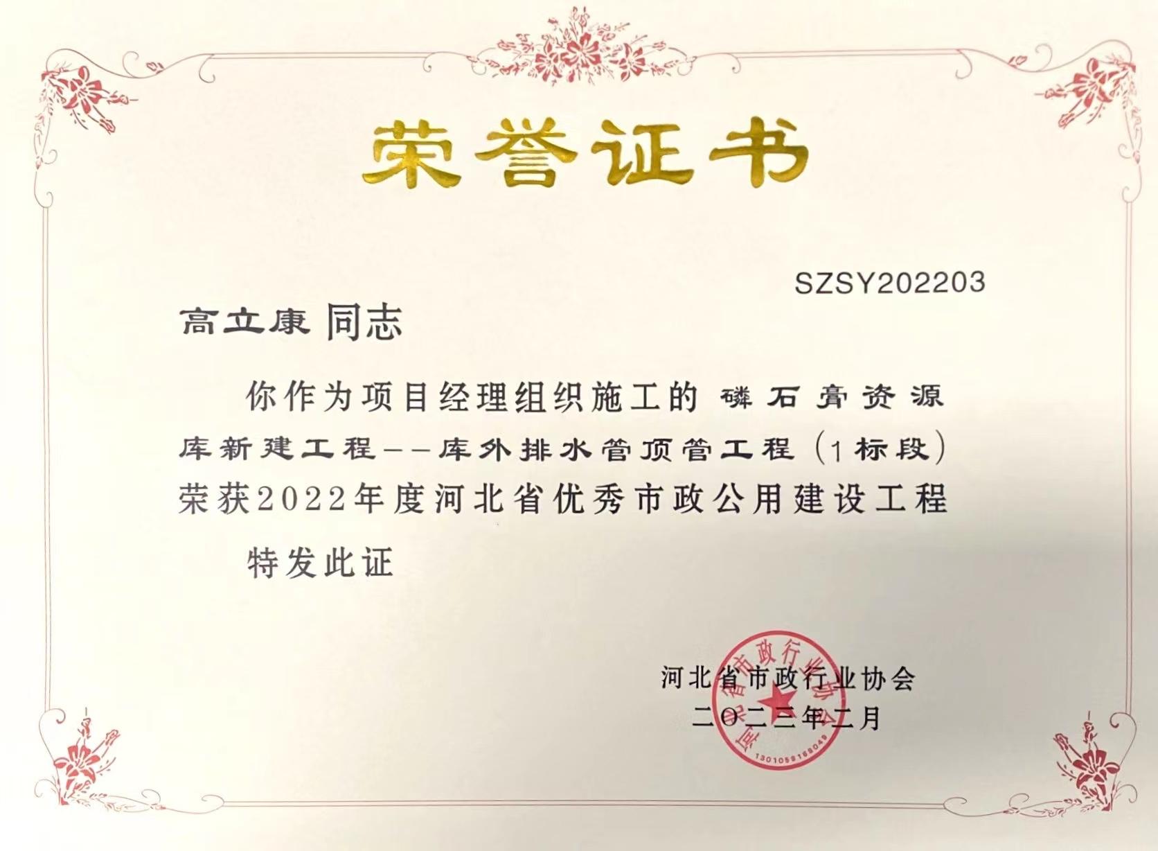 近日,河北省市政行业协会发布消息,经过审核申报材料、查验施工现场、专家综合评议,我公司市政工程项目“磷石膏资源库新建工程——库外水管顶管工程(1标段)”被评为河北省优秀市政公用建设工程,并为项目经理高立康同志颁发了荣誉证书。