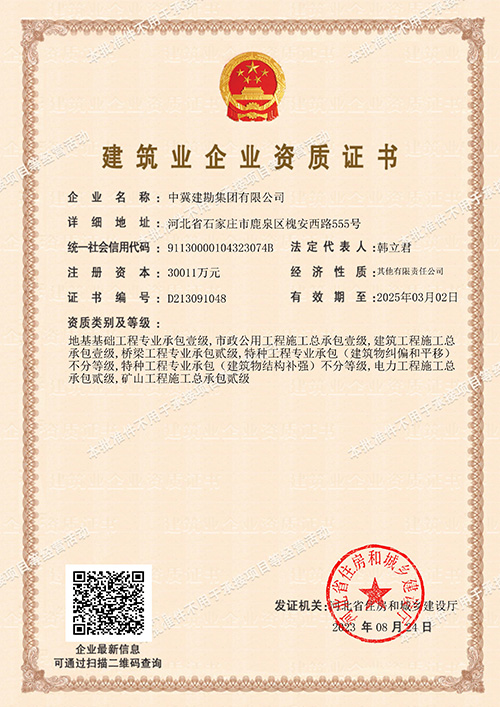 集团公司于2023年8月24日喜获电力工程施工总承包贰级资质,该资质的取得将大力促进我公司在电力能源市场的业务拓展能力,由电力项目的地基基础专业承包向土建、安装总成承包迈进,为独立承接风电、光电等电力新能源项目提供了准入证。