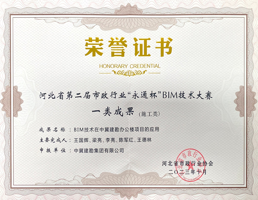 近日,河北省市政行业协会发文《关于公布河北省市政行业第二届“永通杯”BIM技术应用大赛结果的通知》(冀市协{2023}37号),我公司参赛项目“BIM技术在中冀建勘办公楼项目的应用”项目荣获一类成果、“BIM技术在燕山文化新城水厂扩建改造项目的应用”项目荣获二类成果。