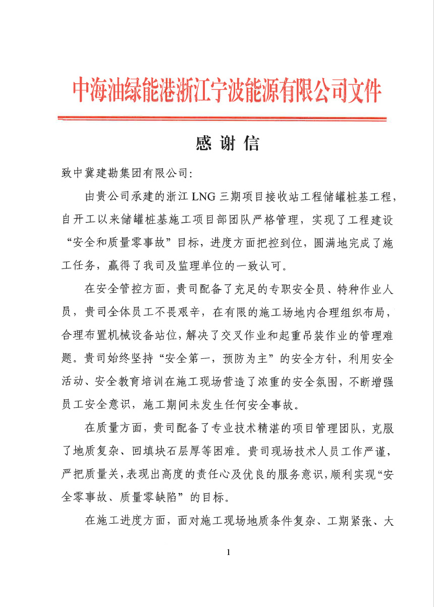 浙江LNG三期接收站储罐项目是国家和省重点能源项目,工期、质量、安全标准要求高,开工前期准备工作多,在集团公司及各级领导的帮助下,项目部全体员工迎难而上,团结协作,精心组织,于2023年3月4日储罐桩基正式开工,并于2023年6月18日完工。施工期间多次收到中海油绿能港浙江宁波能源有限公司颁发的各种优秀奖项,也得到了业主方的高度认可,也为我公司后续在承接中海油工程施工奠定了良好的基础。