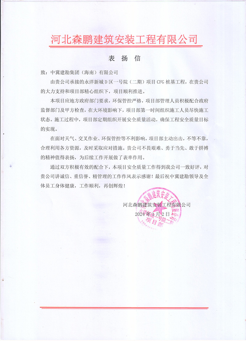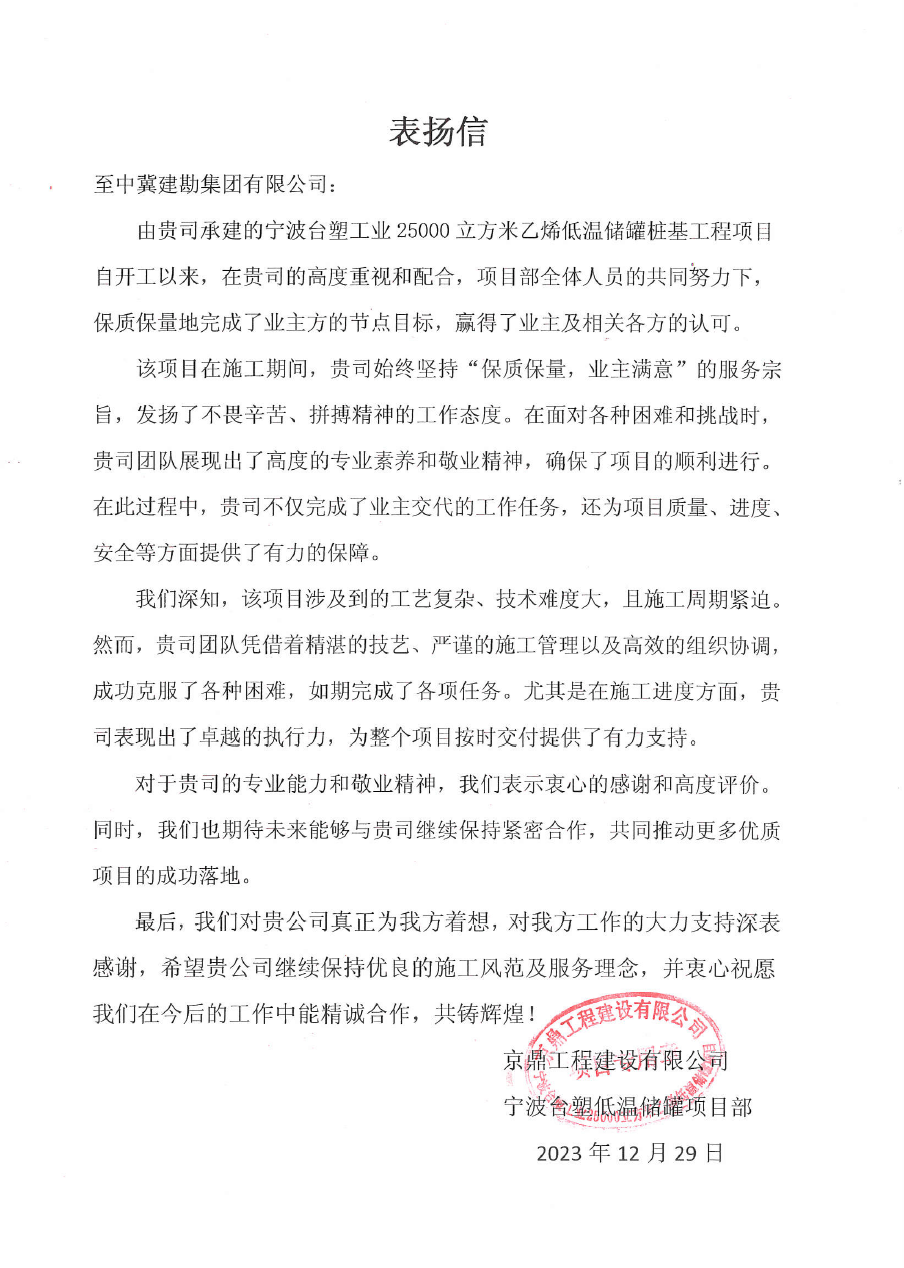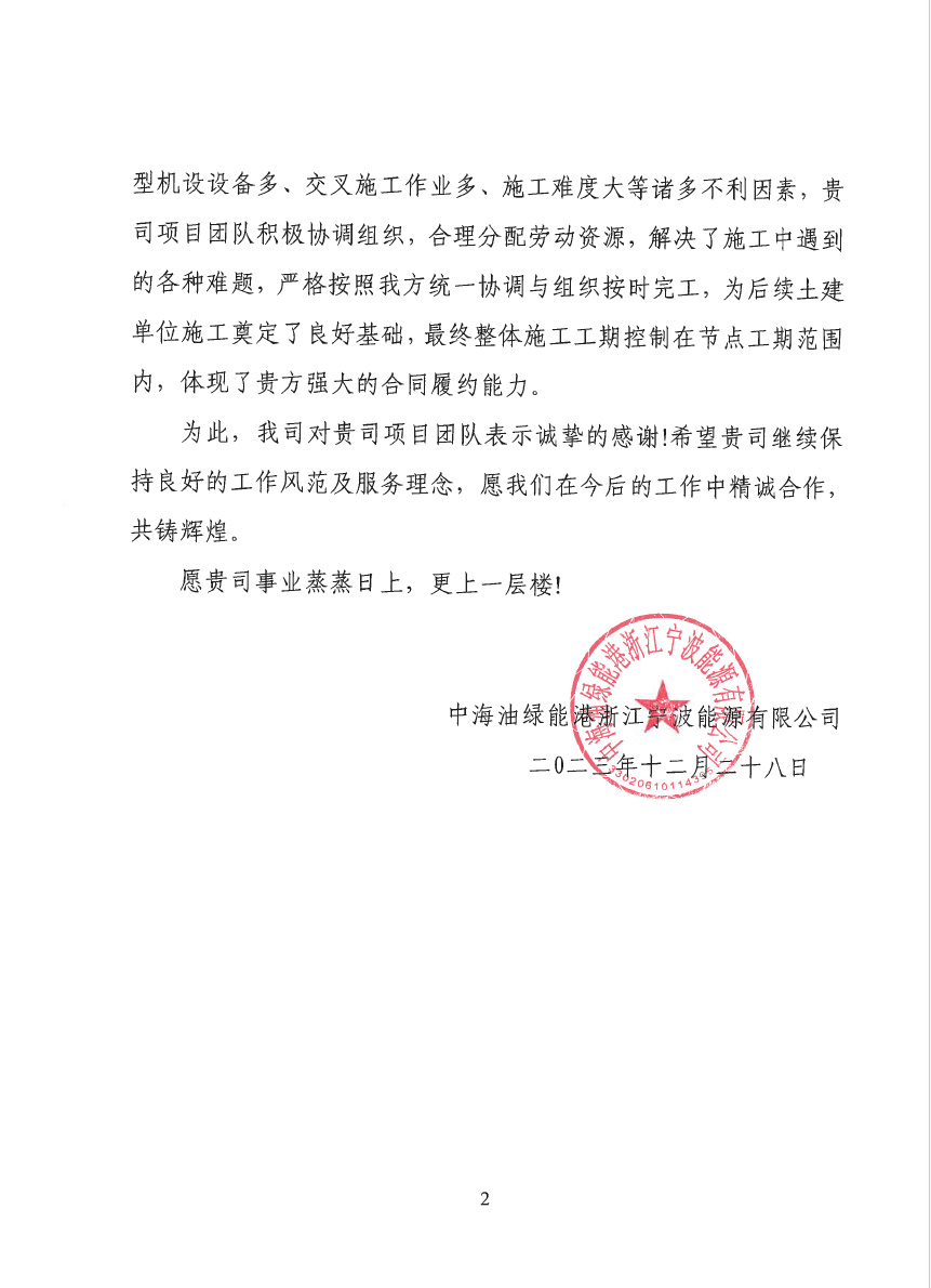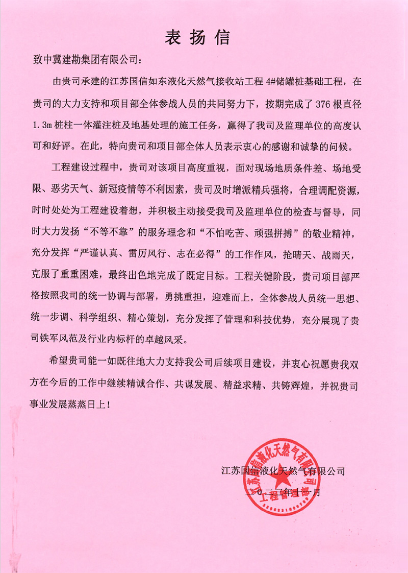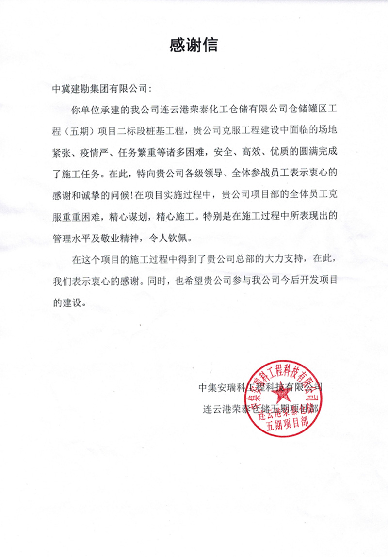 连云港荣泰化工仓储有限公司仓储罐区工程(五期)项目二标段桩基工程,业主在表扬信中说:贵公司克服工程建设中面临的场地紧张、疫情严、任务繁重等诸多困难,安全、高效、优质的圆满完成了施工任务。贵公司项目部全体员工克服重重困难,精心谋划,精心施工。特别是在施工中所表现出的管理水平及敬业精神,令人钦佩。