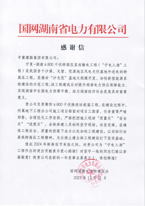 国家电网湖南电力特高压办,为我公司承建的衡阳±800千伏换流站工程桩基项目部发来感谢信一封。感谢信内容主要表达了,面对项目的工期紧,任务重等关键形势,称赞我公司能严格把质量关,安全关和进度关。