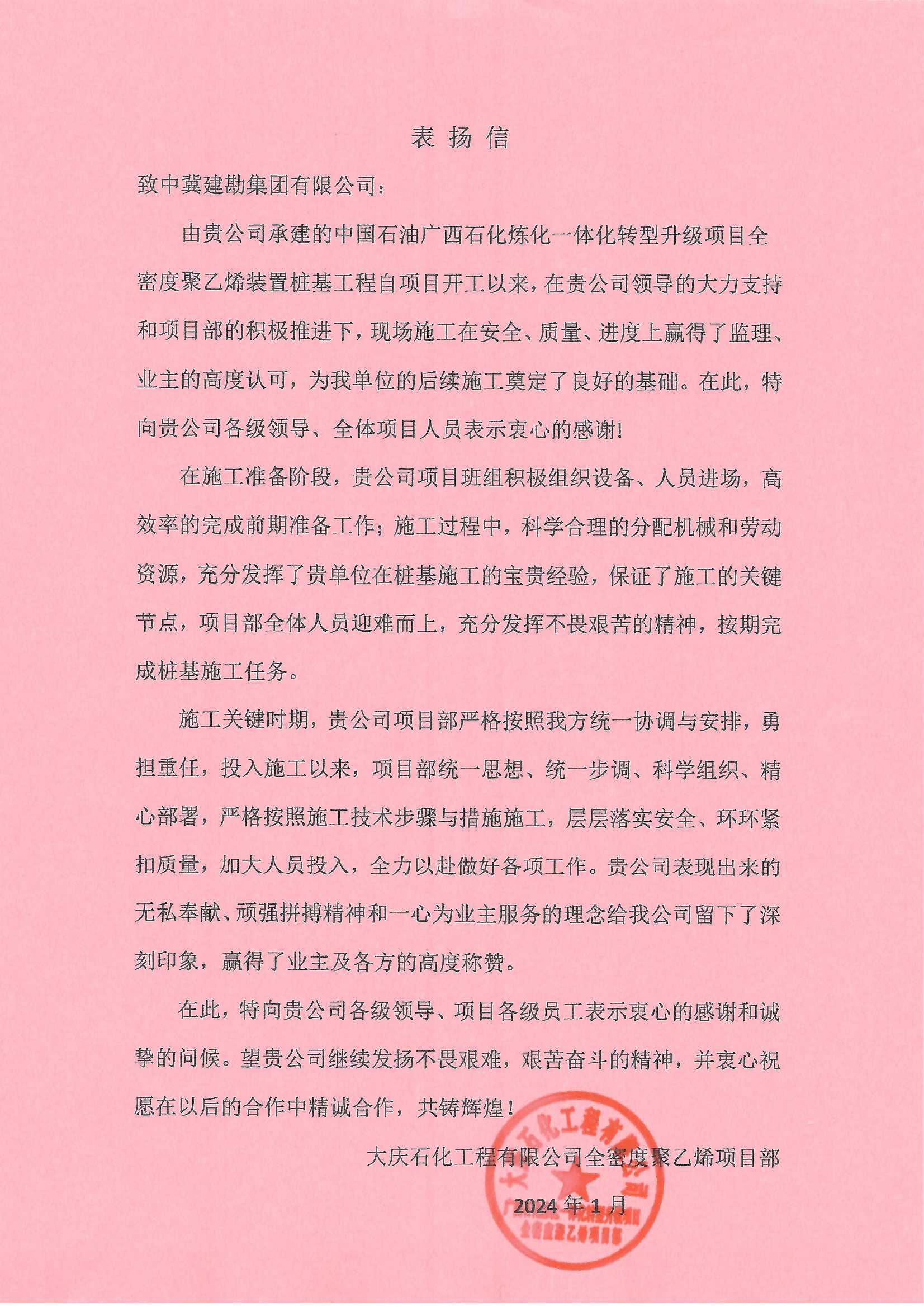 广西石化炼化项目部接收到大庆石化工程有限公司全密度聚乙烯工程建设部项目经理牛家伟发来的表扬信,信中肯定了我项目部在广西石化炼化项目桩基工程中所取得的成果。