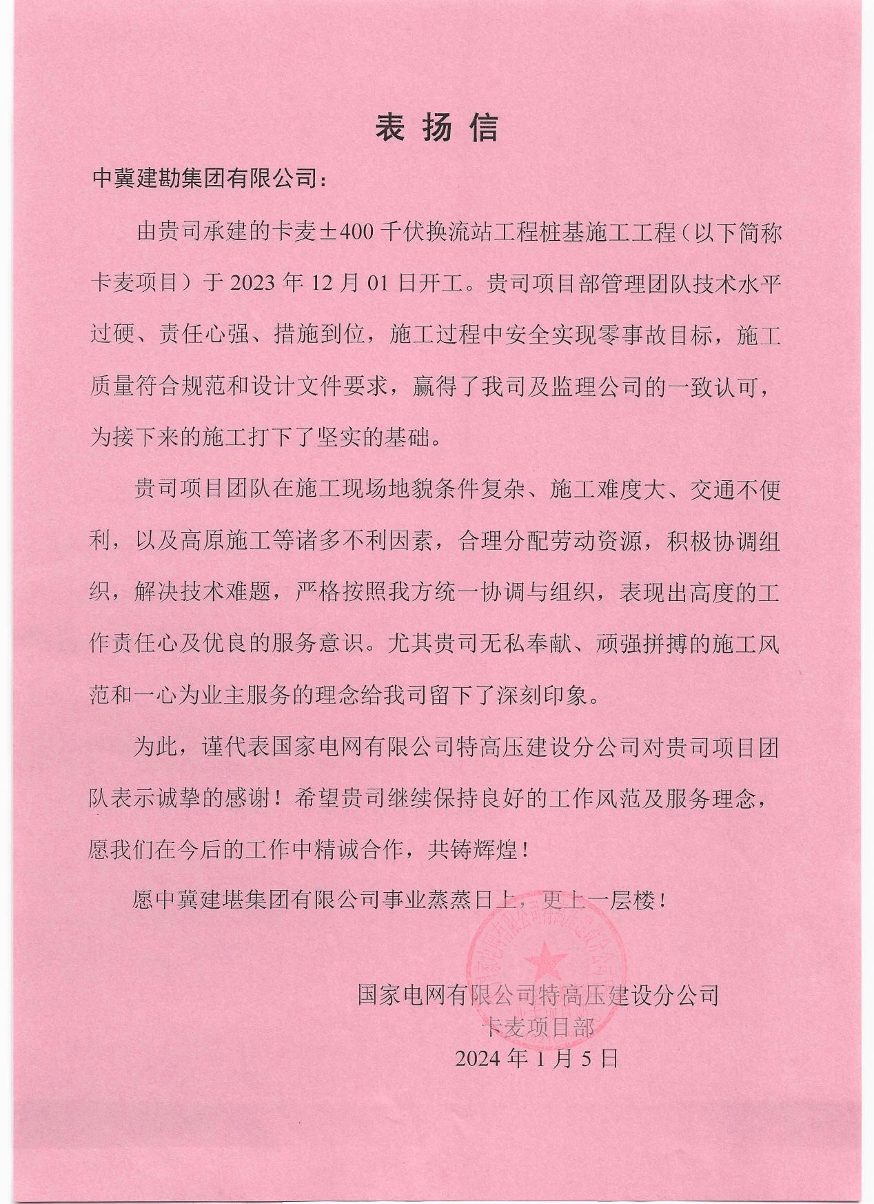卡麦±400千伏换流站工程桩基施工工程收到业主国家电网有限公司特高压建设分公司发来的表扬信。项目部敢打硬仗的精神面貌,赢得了业主方的高度赞赏和认可。