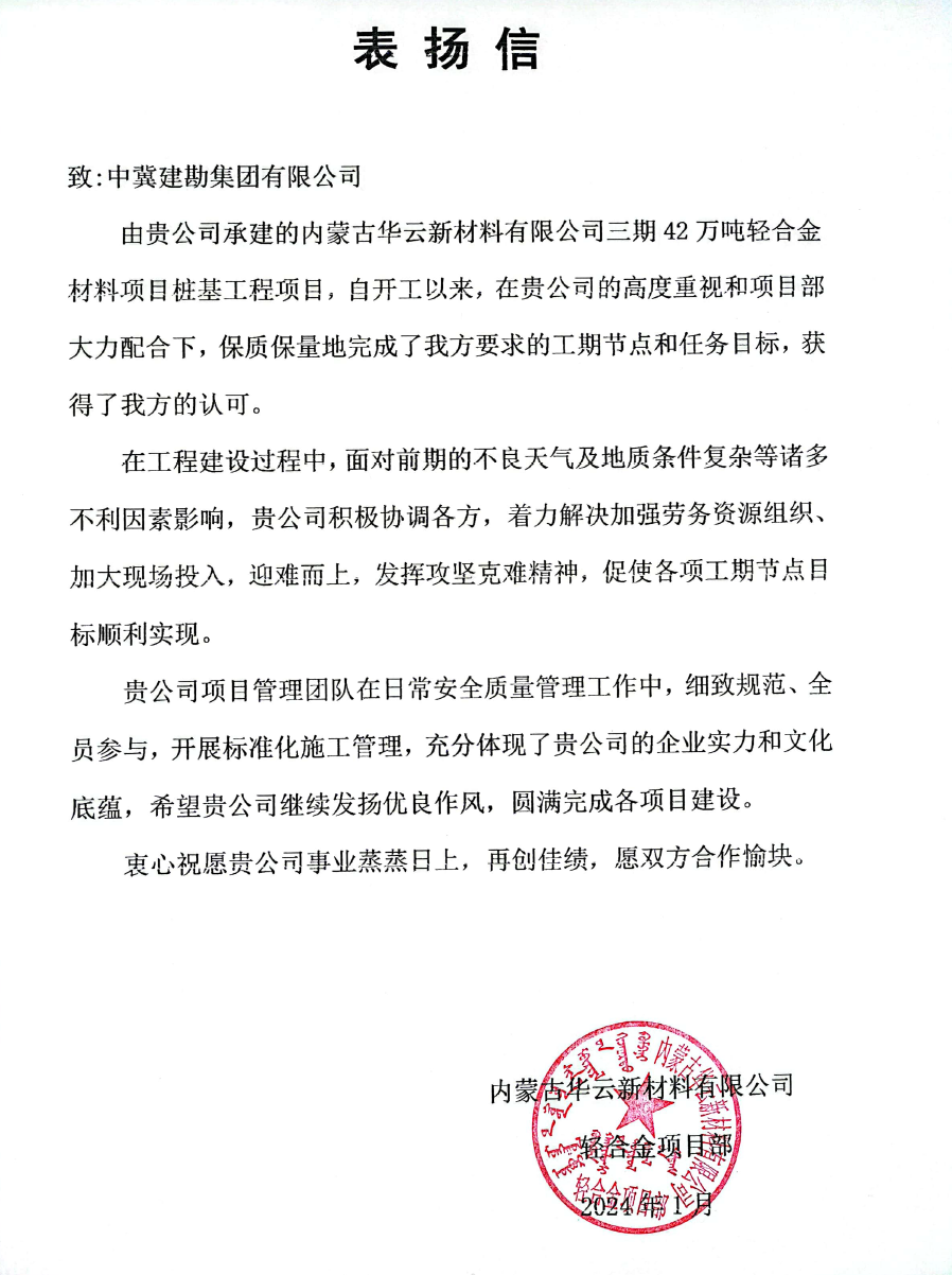 内蒙古华云新材料有限公司三期42万吨轻合金材料项目桩基工程,在工程建设过程中,面对前期的不良天气及地质条件复杂等诸多不利因素影响,积极协调各方,着力解决加强劳务资源组织、加大现场投入,迎难而上,发挥攻坚克难精神,保质保量地完成了工期节点和任务目标,获得甲方的认可。