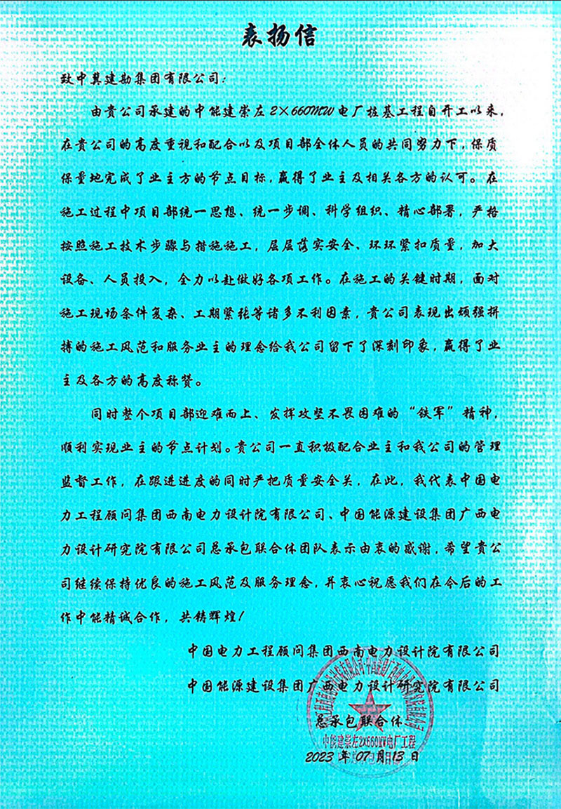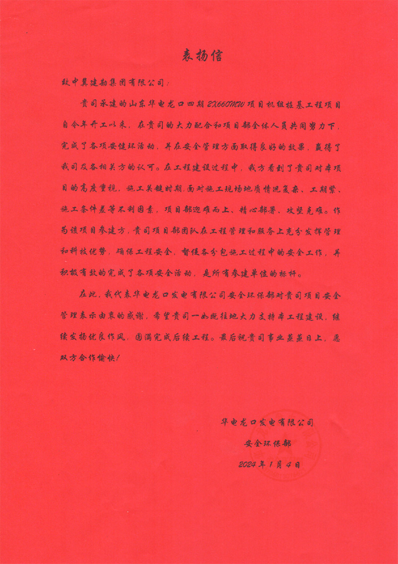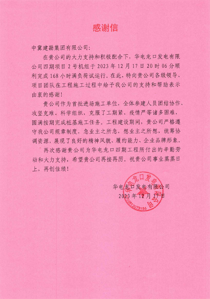 华电龙口发电有限公司四期项目2号机组于2023年12月17日20时04分顺利完成168小时满负荷试运行。工程建设期间,完成了各项安健环活动,并在安全管理方面取得良好的效果,赢得了业主方认可。我公司人员严格遵守我公司规章制度,急业主之所急,想业主之所想,统筹协调资源,展现了良好的精神风貌、履约能力、企业品牌形象。为此,业主特向我公司各级领导、项目团队在工程施工过程中给予的支持和帮助表示由衷感谢。