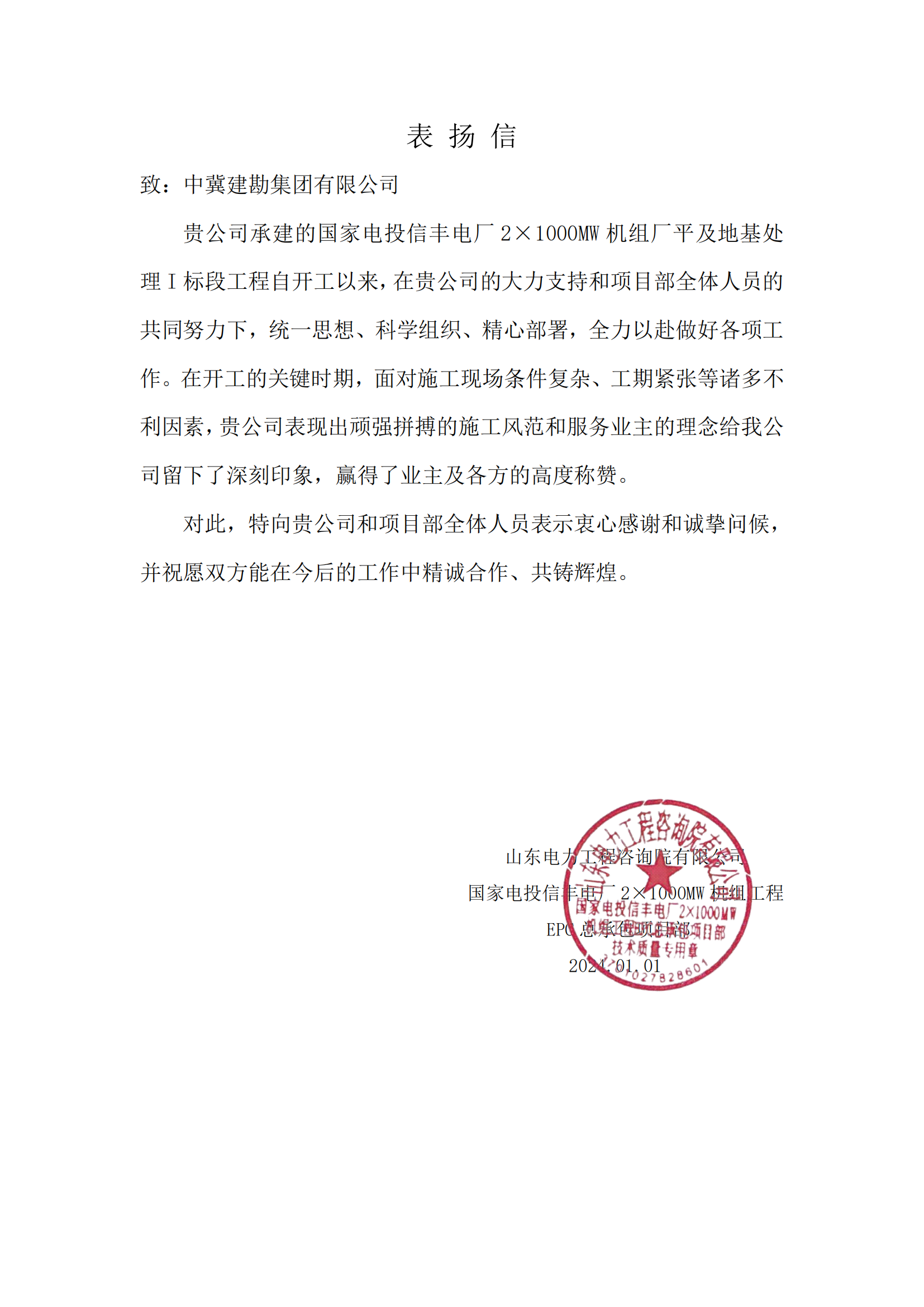国家电投信丰电厂2×1000W机组厂平及地基处理一标段工程,在开工的关键时期,面对施工现场条件复杂、工期紧张等诸多不利因素,我公司表现出顽强拼搏的施工风范和服务业主的理念,赢得了业主及各方的高度称赞。