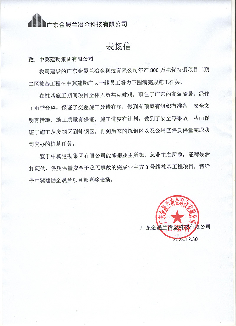 广东金盛兰冶金科技有限公司年产800万吨优特钢项目二期二区桩基工程,在施工期间项目全体人员共克时艰,顶住了广东的高温酷暑,经住了雨季台风,保证了交差施工分错有序,做到了预案有组织有准备,安全文明有措施,施工质量有保证,施工进度有计划,做到了安全零事故,保质保量的完成任务,业主对项目给予嘉奖表扬。