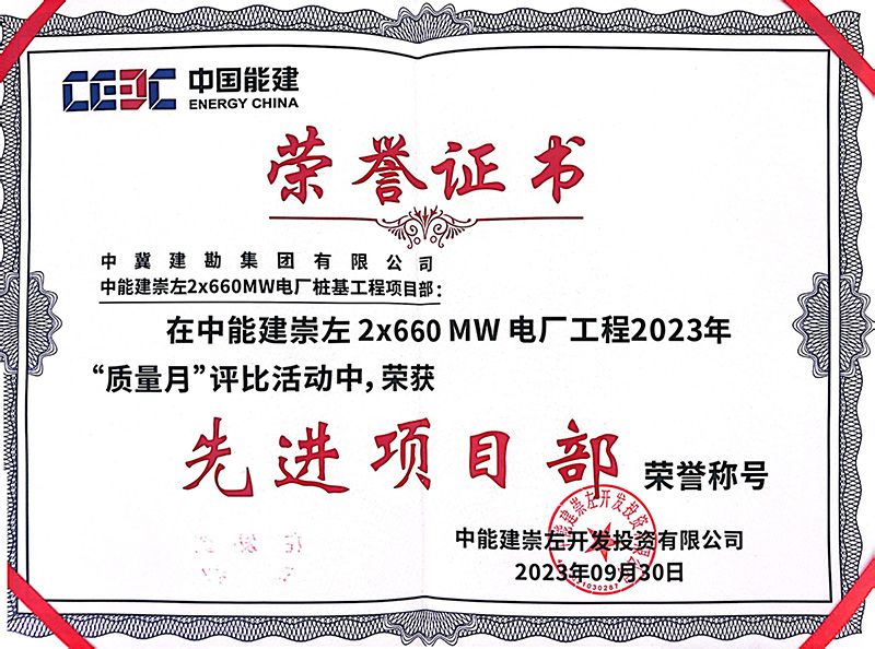 中能建崇左2×660MW电厂桩基工程,在施工过程中,项目部统一思想、统一步调、科学组织,精心部署,严格按照施工技术步骤与措施施工,层层落实安全,环环紧扣质量,加大设备、人员投入,全力以赴做好各项工作。全体员工以顽强拼搏的施工风范和服务业主的理念给我公司留下了深刻印象,赢得了业主及各方的高度称赞。