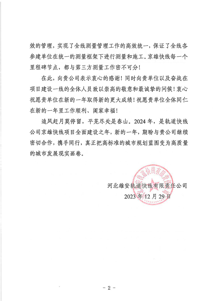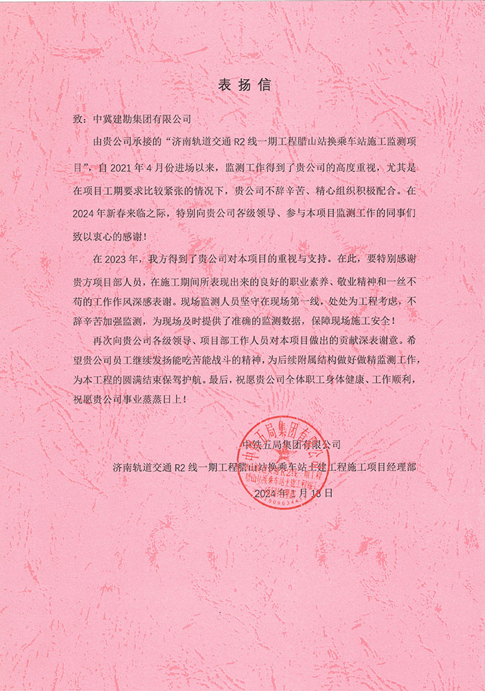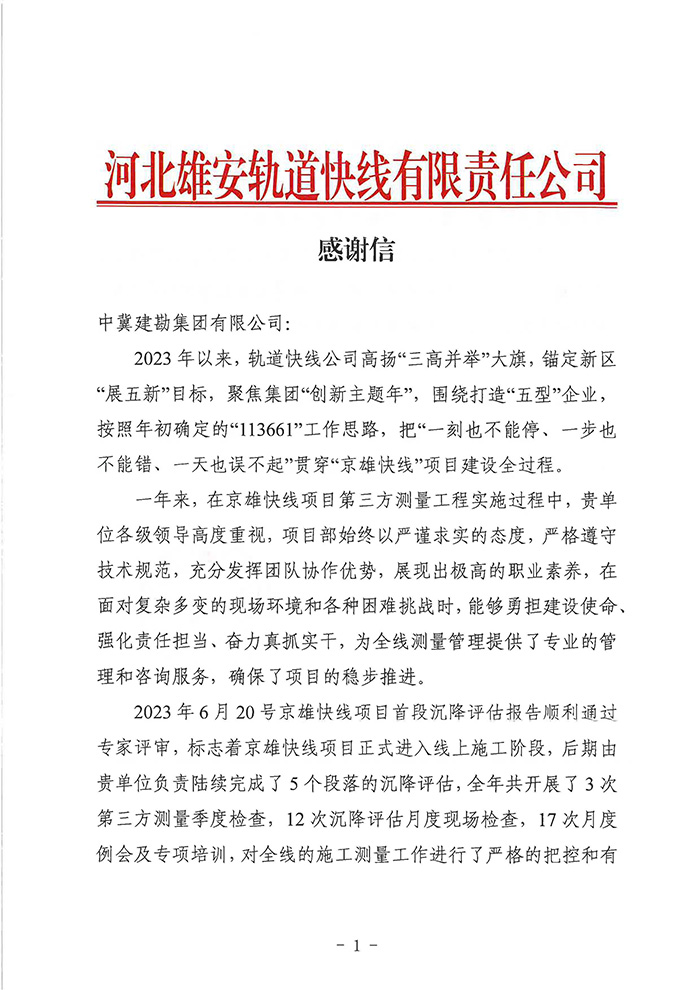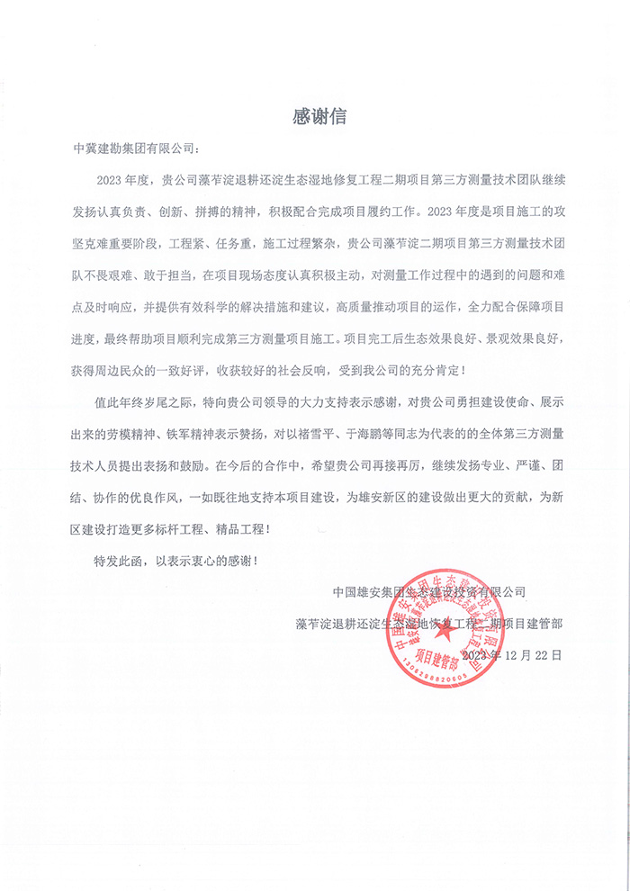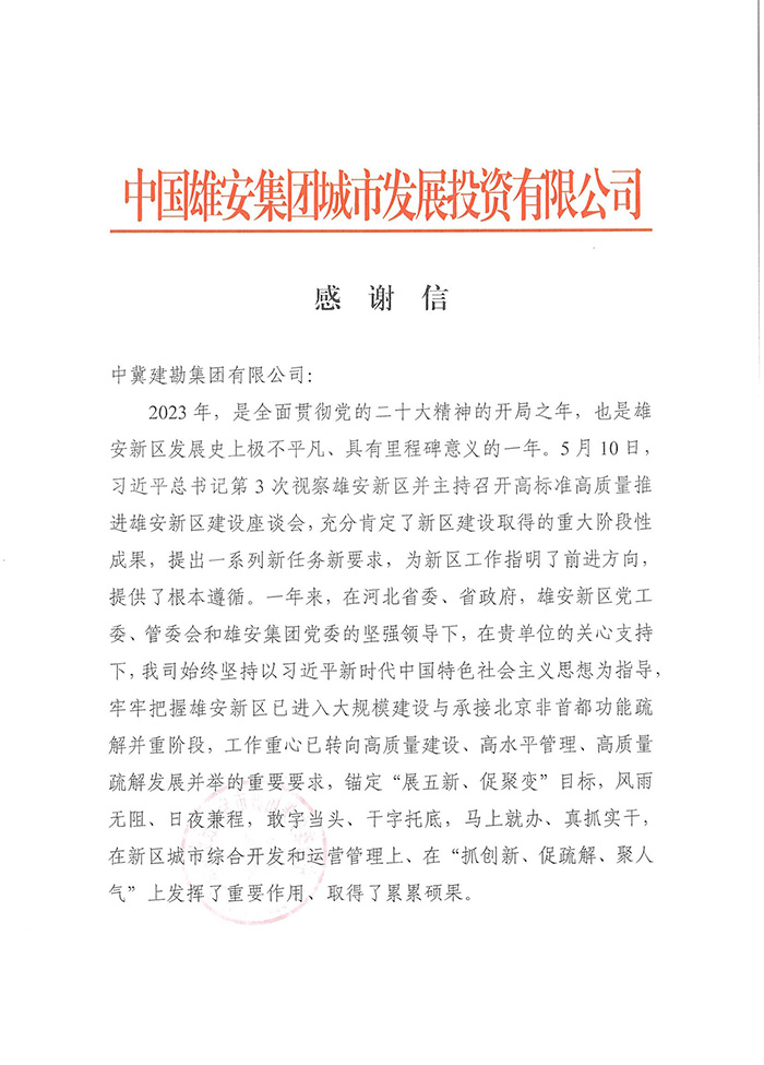 近期,公司陆续收到中国雄安集团城市发展投资有限公司、河北雄安轨道快线有限责任公司、中国雄安集团生态建设投资有限公司、中铁五局、中铁十七局、郑州地铁集团、内蒙古大唐国际克什克腾旗煤制天然气电厂、大唐内蒙古多伦电厂等业主单位发来的感谢信。我公司认真负责、敢打能打硬仗的工作态度、顽强拼搏的施工风范和一心为业主服务的理念,赢得了业主的高度认可和赞扬,特发来感谢信深表感谢!