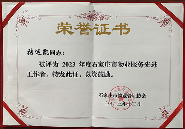 中冀建勘物业服务有限公司荣获“2023 年度石家庄市物业管理先进单位”和“2023年度石家庄市物业服务先进单位”两项荣誉称号,张运凯同志荣获“物业服务先进工作者”荣誉称号。
