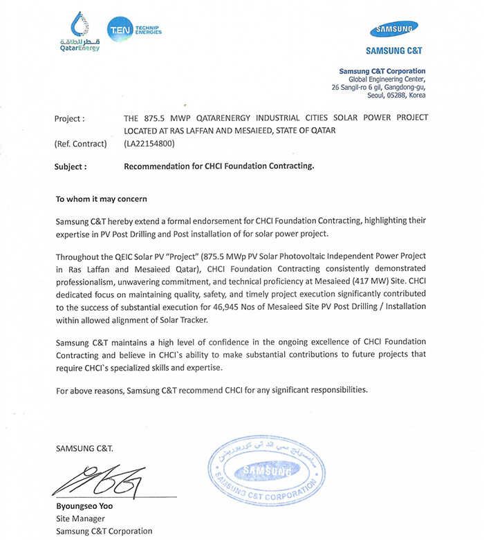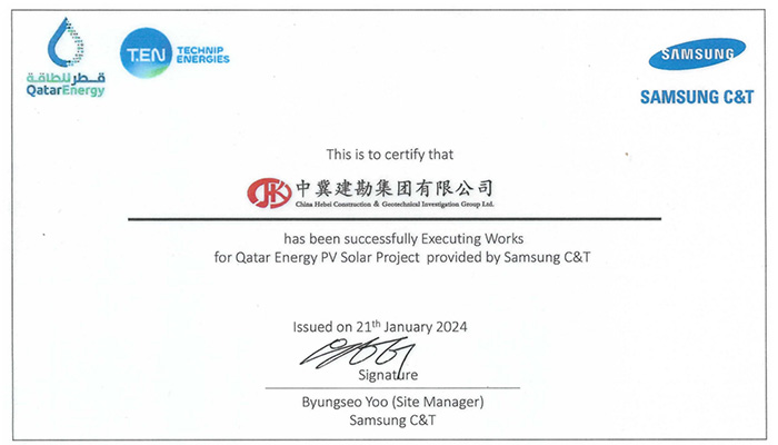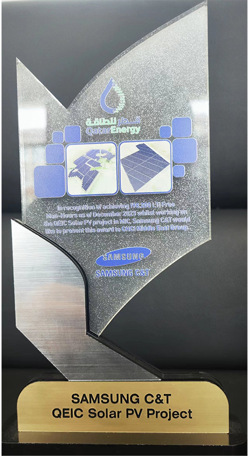 我公司收到卡塔尔能源875.5MW光伏发电项目业主方卡塔尔能源和总包方三星C&T公司联合颁发的奖杯和推荐信。业主及总包方高度认可我公司项目履约能力,赞扬我司对该项目成功交付做出重大贡献,表示愿意与我司建立长期合作关系。基于我司卓越的履约表现,三星C&T公司授予我司推荐信。
