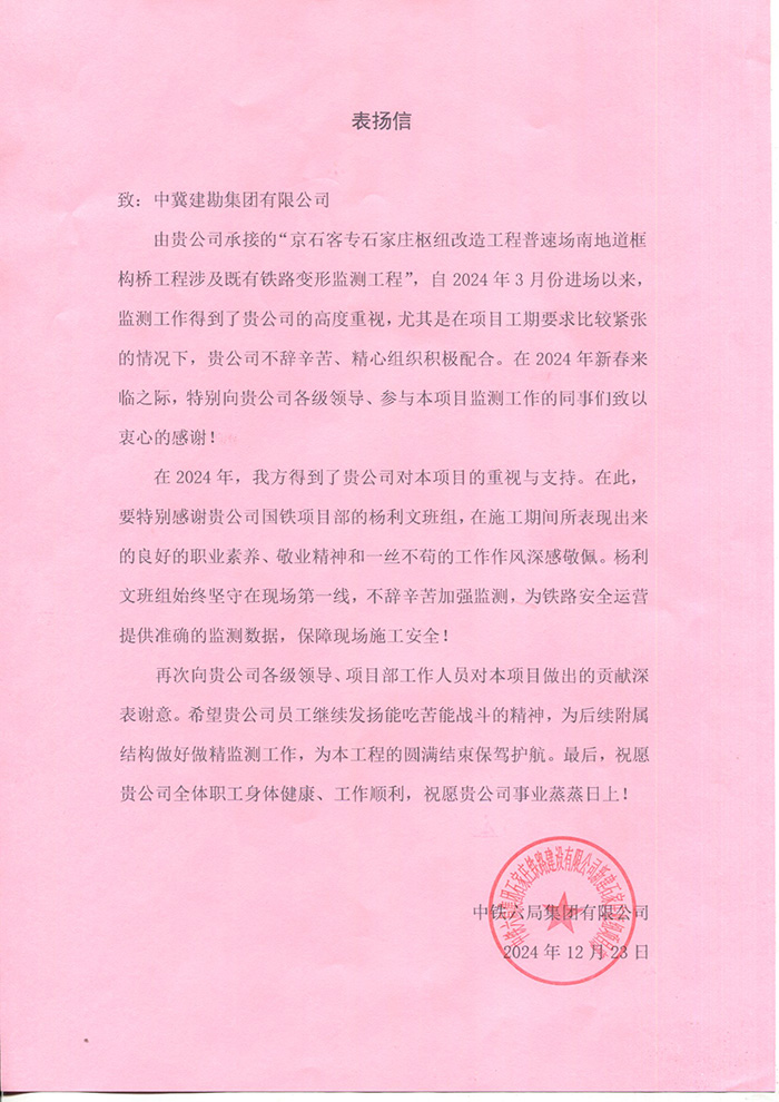 近期,集团公司陆续收到中国铁路北京局集团有限公司、中铁六局集团有限公司、新疆兵准信弘能源有限责任公司、任丘市供水有限公司发来的感谢信、表扬信以及优秀合作单位荣誉奖牌、先进工作者荣誉证书。