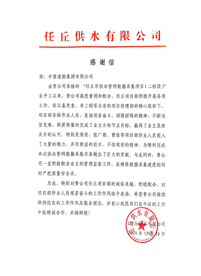任丘市供水管网数据采集(二标段)项目,自开工以来领导十分重视,统筹安排,精心组织,项目部全体作业人员发扬艰苦奋斗,顽强拼搏的精神,不断攻坚克难,保质保量顺利完成了供水管网数据采集项目。我公司认真负责、诚信卓越、一心为业主服务的工作精神赢得了业主的高度认可和赞扬,同时对本项目表现突出的工作人员颁发了“2024年度先进工作者”荣誉证书。