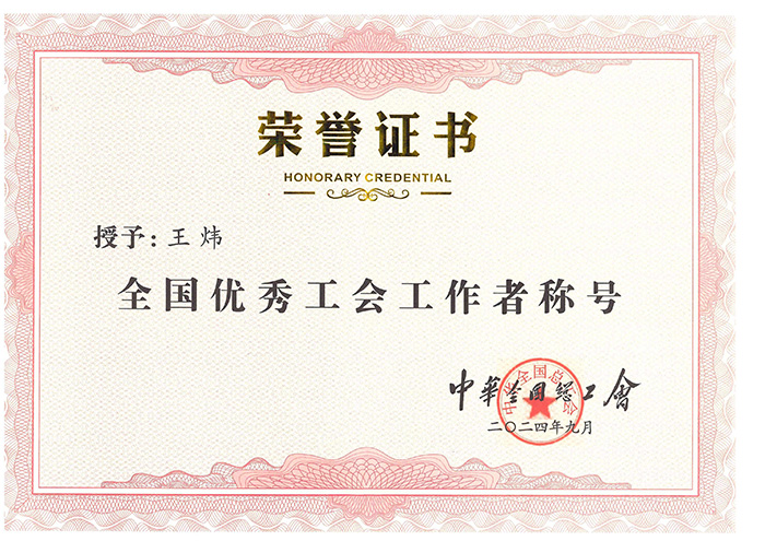 王炜同志荣获中华全国总工会“全国优秀工会工作者”荣誉称号