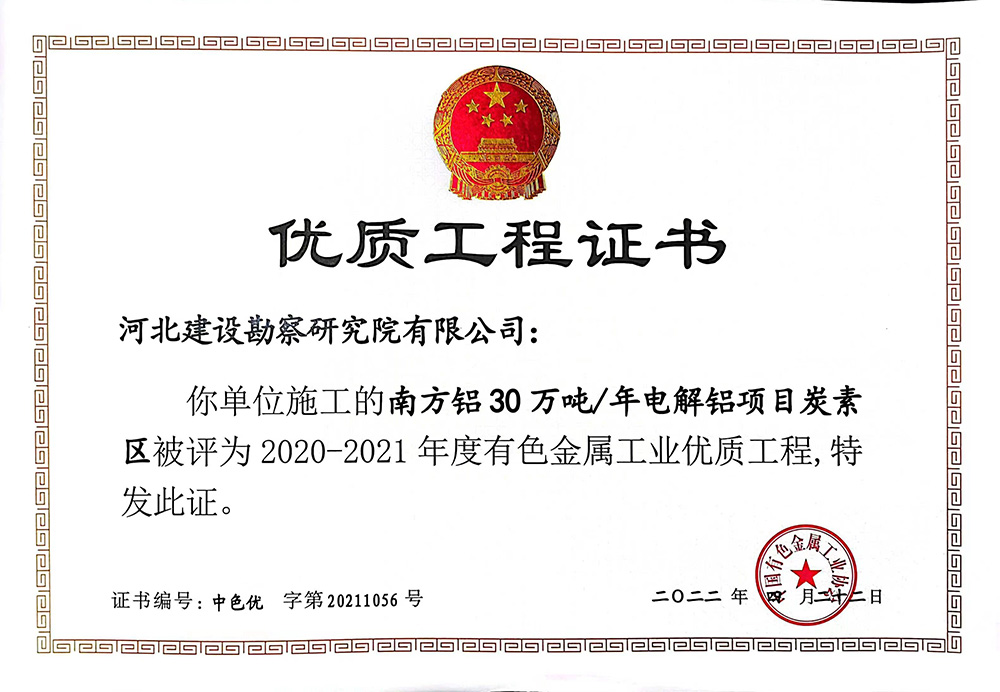 The Carbon Area of the Nanfang Aluminum 300,000 tons/year Electrolytic Aluminum Project constructed by our company was awarded the 2020-2021 Excellent Engineering Award in Non-ferrous Metal Industry.